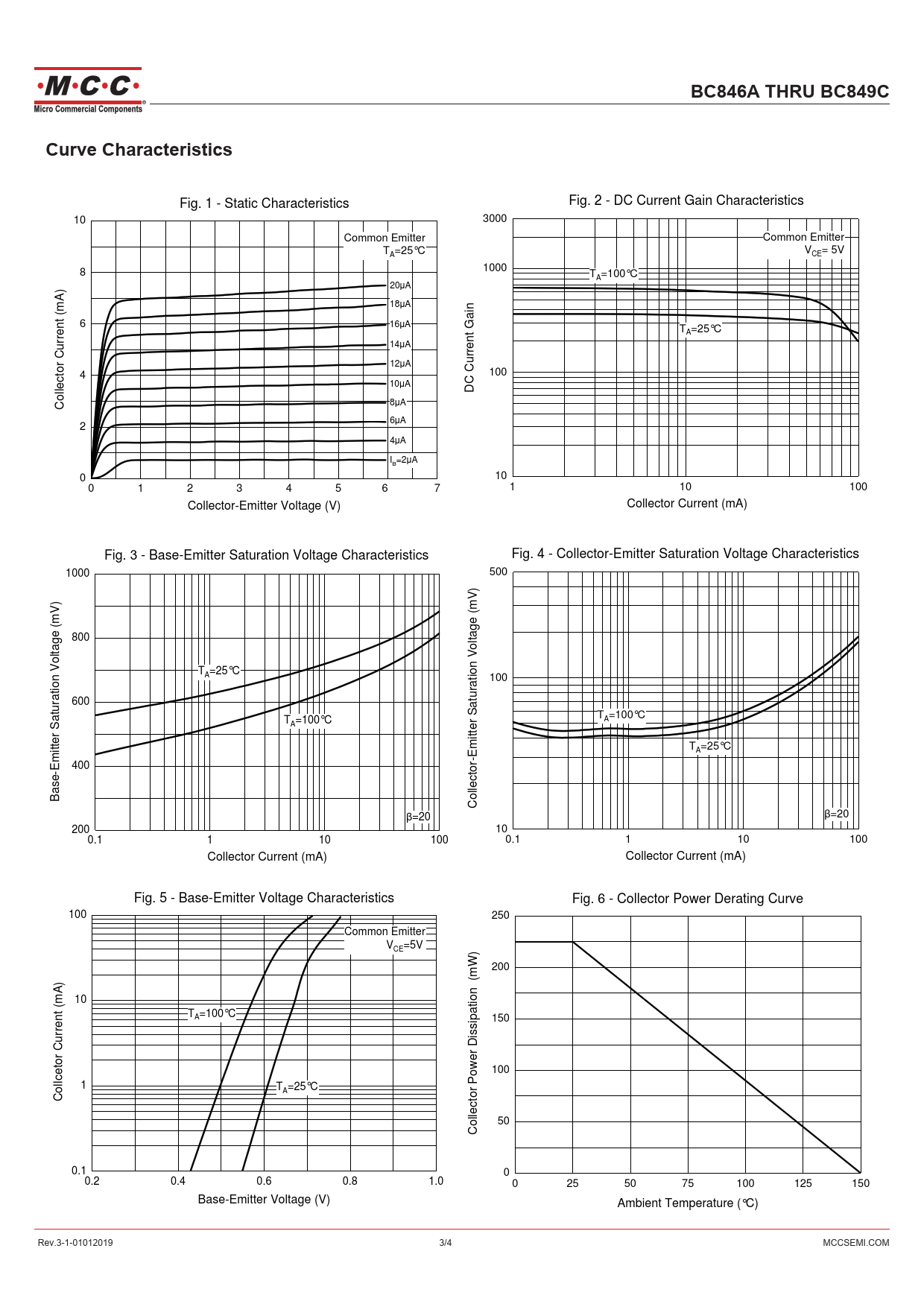 BC846A THRU BC849CCurve Characteristics Fig. 1 - Static Characteristics Fig. 2 - DC Current Gain Characteristics 10 3000 Common Emitter Common Emitter T =25°C V = 5V A CE 8 1000 T =100°C A 20μA 18μA 6 16μA T =25°C A 14μA 12μA 4 100 10μA DC Current Gain Collector Current (mA) 8μA 6μA 2 4μA I =2μA B 0 10 0 1 2 3 4 5 6 7 1 10 100 Collector-Emitter Voltage (V) Collector Current (mA) Fig. 3 - Base-Emitter Saturation Voltage Characteristics Fig. 4 - Collector-Emitter Saturation Voltage Characteristics 1000 500 800 T =25°C A 100 600 T =100°C T =100°C A A T =25°C A 400 Base-Emitter Saturation Voltage (mV) Collector-Emitter Saturation Voltage (mV) β=20 β=20 200 10 0.1 1 10 100 0.1 1 10 100 Collector Current (mA) Collector Current (mA) Fig. 5 - Base-Emitter Voltage Characteristics Fig. 6 - Collector Power Derating Curve 100 250 Common Emitter V =5V CE 200 10 T =100°C A 150 100 1 T =25°C A Collcetor Current (mA) 50 Collector Power Dissipation (mW) 0.1 0 0.2 0.4 0.6 0.8 1.0 0 25 50 75 100 125 150 Base-Emitter Voltage (V) Ambient Temperature (°C) Rev.3-1-01012019 3/4 MCCSEMI.COM