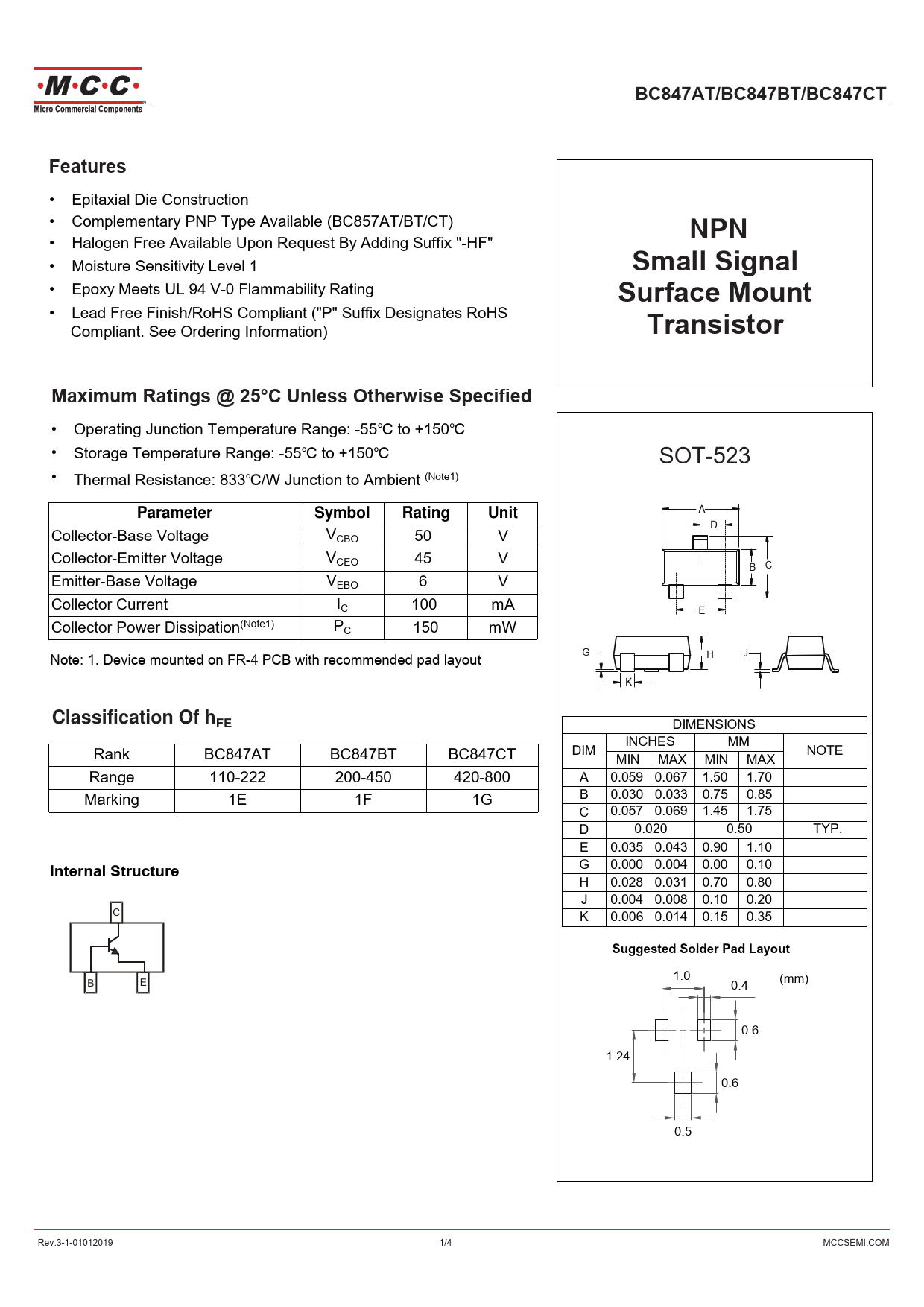 Datasheet BC847AT, BC847BT, BC847CT (MCC)