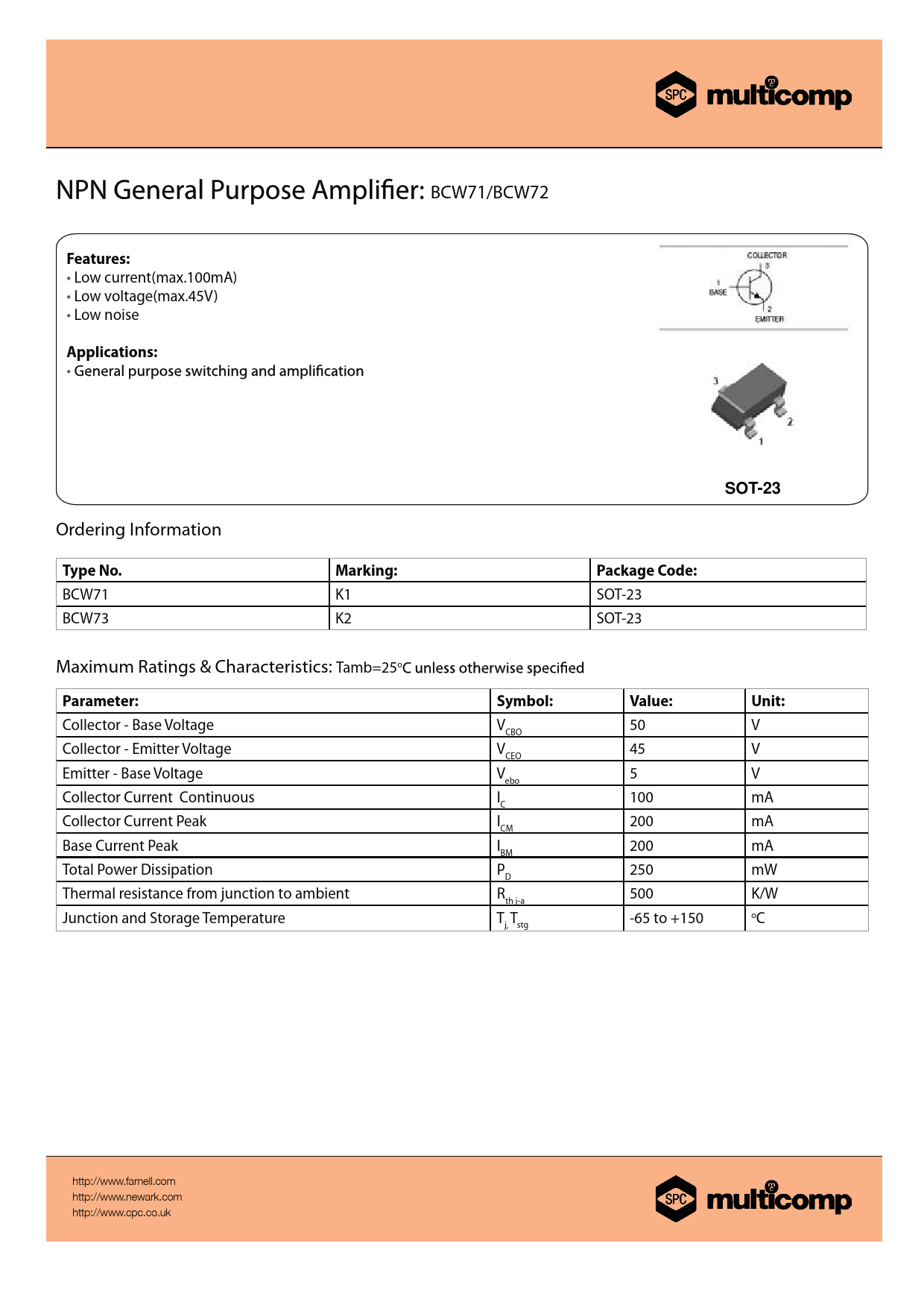 BCW71 K1 SOT-23 BCW73 K2 SOT-23 Maximum Ratings & Characteristics: Tamb=25o
