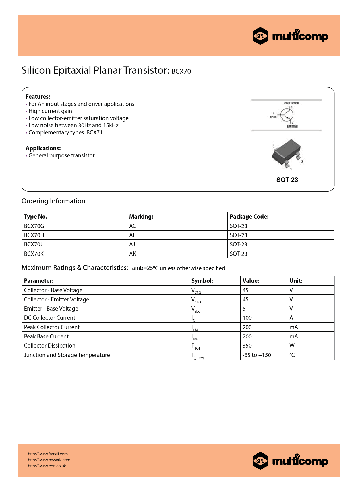 Datasheet BCX70 Multicomp