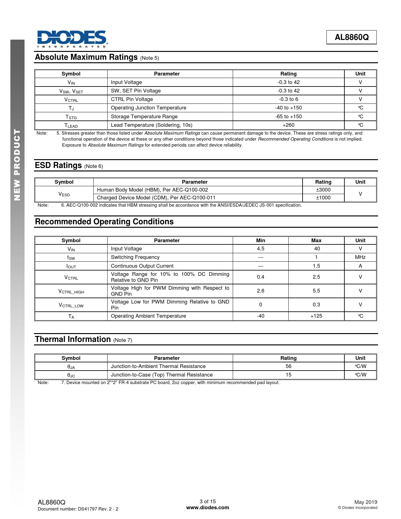 AL8860Q. Absolute Maximum Ratings. Symbol. Parameter. Rating. Unit. ESD Ratings. Recommended Operating Conditions. Min. Max