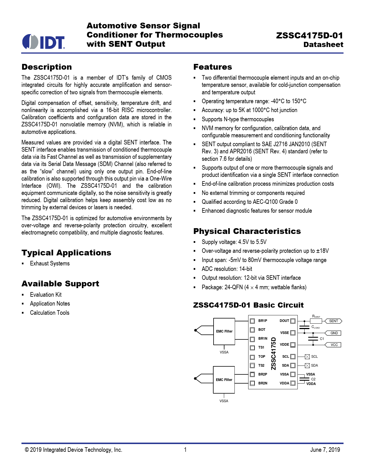 VSSA © 2019 Integrated Device Technology, Inc. 1 June 7, 2019 Document Outline 1. Pin Assignments 2. Pin Descriptions 3. Absolute Maximum Ratings 4. Operating Conditions 5. Electrical Characteristics 6. Interface Characteristics and Nonvolatile Memory 7. Circuit Description 7.1 General Operation Description 7.2 Signal Path 7.3 Signal Conditioning 7.3.1 Thermocouple Sensor Signal Conditioning 7.3.2 Internal Temperature Sensor Signal Conditioning 7.4 Analog Front-End 7.4.1 Overview 7.4.2 SCCM 7.4.3 Input Multiplexer 7.4.4 Programmable Gain Amplifier 7.4.5 Analog-to-Digital Converter 7.5 Signal Measurement 7.5.1 Thermocouple Element Measurement 7.5.2 Internal Temperature Measurement 7.5.3 Isolation Conductance Measurement (Giso) 7.5.4 Thermocouple Resistor Measurement (Ropen) 7.5.5 Measurement Cycle 7.6 SENT Output 7.6.1 Overview 7.6.2 SENT Fast Channel Modes and Frame Format 7.6.3 SENT SDM Channel Modes 7.6.4 SENT Output Operation Modes 7.6.5 SENT Pulse Shaping 7.7 NVM OEM Data Memory 7.8 Over-Voltage and Short-Circuit Protection 8. Fault-Safe Operation 8.1 Fault-Safe Operation Modes 8.2 Fault Messaging 8.2.1 Overview 8.2.2 SENT Fast Channel Fault Codes 8.2.3 SENT Status Bits 8.2.4 SENT SDM Channel Status Codes 8.2.5 Timing Definitions 9. Fault Checks 9.1 Overview 9.2 Hardware Fault Checks 9.3 Application Monitors 9.4 Transmission Fault Checks 10. Application Circuit and External Components 11. ESD Protection and EMC Specification 11.1 ESD Protection 11.2 Electromagnetic Emission 11.3 Conducted Susceptibility (DPI) 12. Reliability and RoHS Conformity 13. Package Outline Drawings 14. Marking Diagram 15. Glossary 16. Ordering Information 17. Revision History
