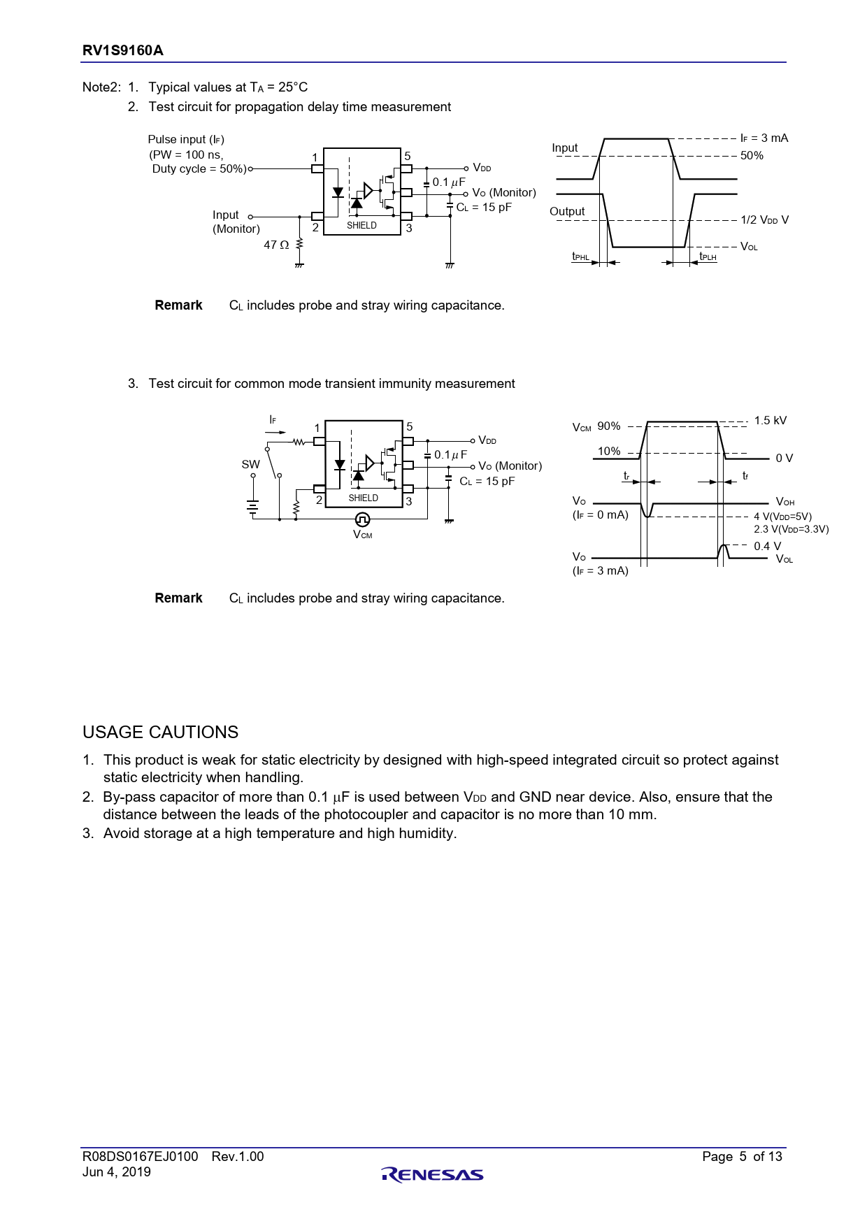 RV1S9160A 章題 Note2: 1. Typical values at TA = 25°C 2. Test circuit for propagation delay time measurement Pulse input (IF) I F = 3 mA Input (PW = 100 ns, 1 5 50% Duty cycle = 50%) VDD 0.1 F VO (Monitor) CL = 15 pF Output Input 1/2 VDD V (Monitor) 2 SHIELD 3 47 W VOL tPHL tPLH Remark CL includes probe and stray wiring capacitance. 3. Test circuit for common mode transient immunity measurement IF 1.5 kV 1 5 VCM 90% VDD 10% 0.1  F 0 V SW VO (Monitor) tr tf CL = 15 pF SHIELD 2 3 VO VOH (IF = 0 mA) 4 V(VDD=5V) V 2.3 V(VDD=3.3V) CM 0.4 V VO VOL (IF = 3 mA) Remark CL includes probe and stray wiring capacitance. USAGE CAUTIONS 1. This product is weak for static electricity by designed with high-speed integrated circuit so protect against static electricity when handling. 2. By-pass capacitor of more than 0.1 F is used between VDD and GND near device. Also, ensure that the distance between the leads of the photocoupler and capacitor is no more than 10 mm. 3. Avoid storage at a high temperature and high humidity. R08DS0167EJ0100 Rev.1.00 Page 5 of 13 Jun 4, 2019