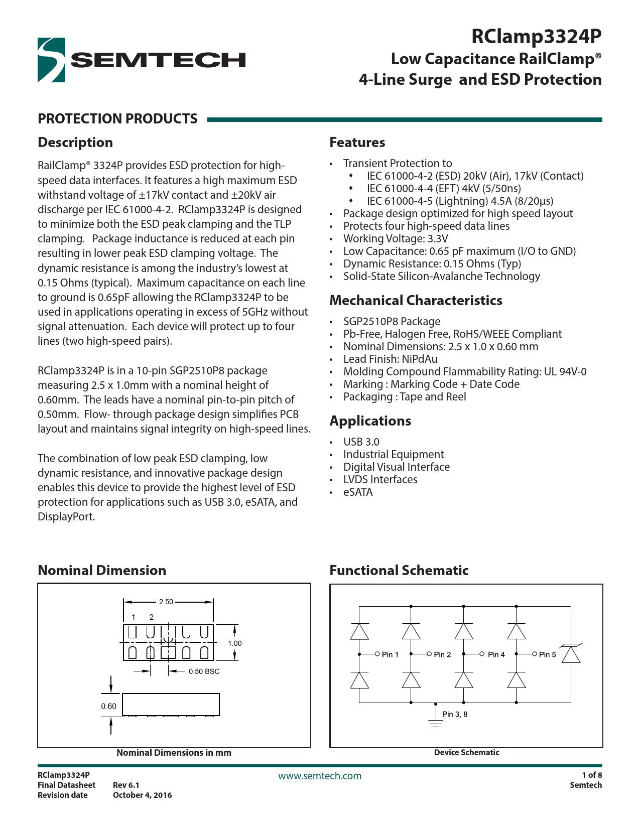 1 of 8 Final Datasheet Rev 6.1 Semtech Revision date October 4, 2016