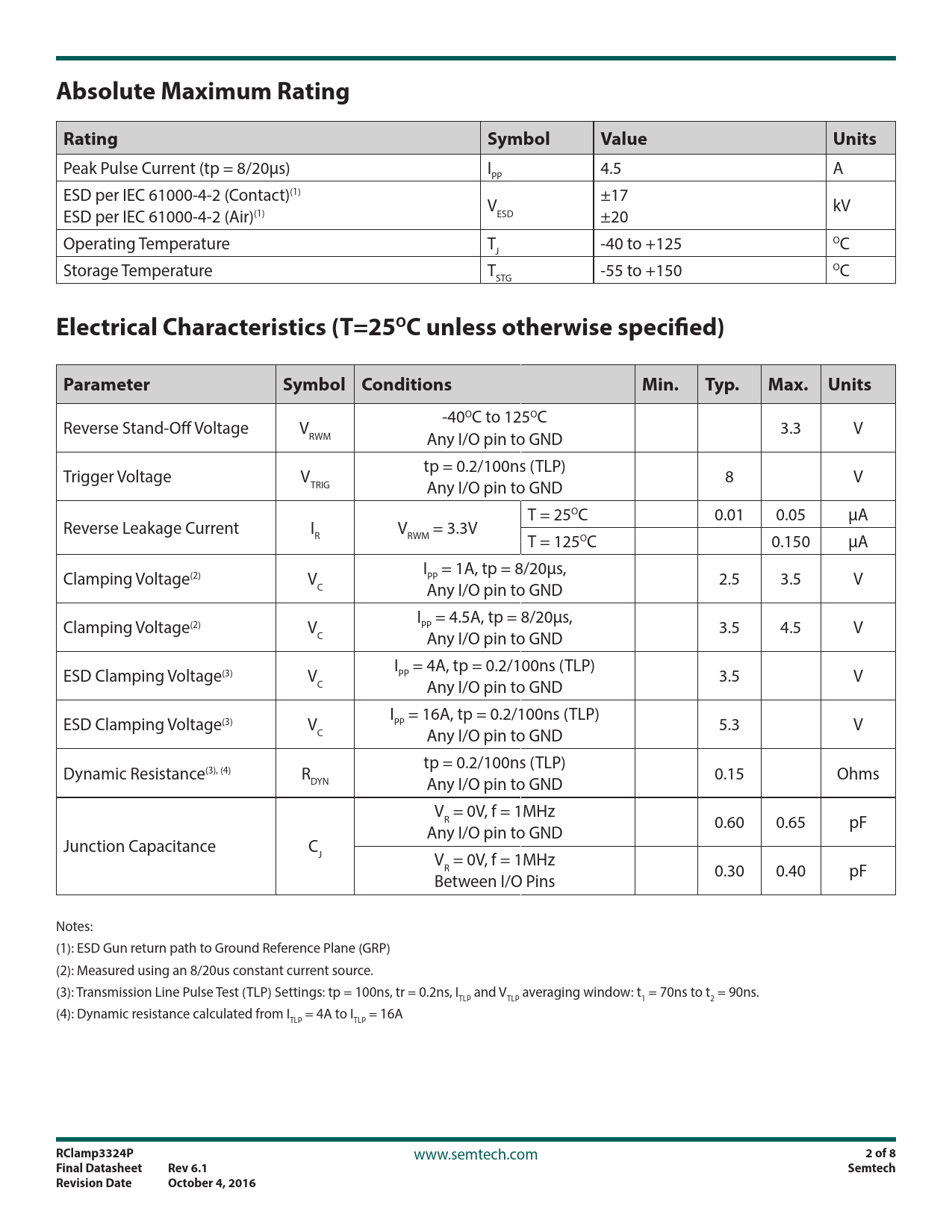 Absolute Maximum RatingRatingSymbolValueUnits Peak Pulse Current (tp = 8/20µs) I 4.5 A PP ESD per IEC 61000-4-2 (Contact)(1) ±17 V kV ESD per IEC 61000-4-2 (Air)(1) ESD ±20 Operating Temperature T -40 to +125 OC J Storage Temperature T -55 to +150 OC STG Electrical Characteristics (T=25OC unless otherwise specified)ParameterSymbol ConditionsMin.Typ.Max. Units -40OC to 125OC Reverse Stand-Off Voltage V 3.3 V RWM Any I/O pin to GND tp = 0.2/100ns (TLP) Trigger Voltage V 8 V TRIG Any I/O pin to GND T = 25OC 0.01 0.05 μA Reverse Leakage Current I V = 3.3V R RWM T = 125OC 0.150 μA I = 1A, tp = 8/20µs, Clamping Voltage(2) V PP 2.5 3.5 V C Any I/O pin to GND I = 4.5A, tp = 8/20µs, Clamping Voltage(2) V PP 3.5 4.5 V C Any I/O pin to GND I = 4A, tp = 0.2/100ns (TLP) ESD Clamping Voltage(3) V PP 3.5 V C Any I/O pin to GND I = 16A, tp = 0.2/100ns (TLP) ESD Clamping Voltage(3) V PP 5.3 V C Any I/O pin to GND tp = 0.2/100ns (TLP) Dynamic Resistance(3), (4) R 0.15 Ohms DYN Any I/O pin to GND V = 0V, f = 1MHz R 0.60 0.65 pF Any I/O pin to GND Junction Capacitance CJ V = 0V, f = 1MHz R 0.30 0.40 pF Between I/O Pins Notes: (1): ESD Gun return path to Ground Reference Plane (GRP) (2): Measured using an 8/20us constant current source. (3): Transmission Line Pulse Test (TLP) Settings: tp = 100ns, tr = 0.2ns, I and V averaging window: t = 70ns to t = 90ns. TLP TLP 1 2 (4): Dynamic resistance calculated from I = 4A to I = 16A TLP TLP RClamp3324P www.semtech.com 2 of 8Final DatasheetRev 6.1SemtechRevision DateOctober 4, 2016