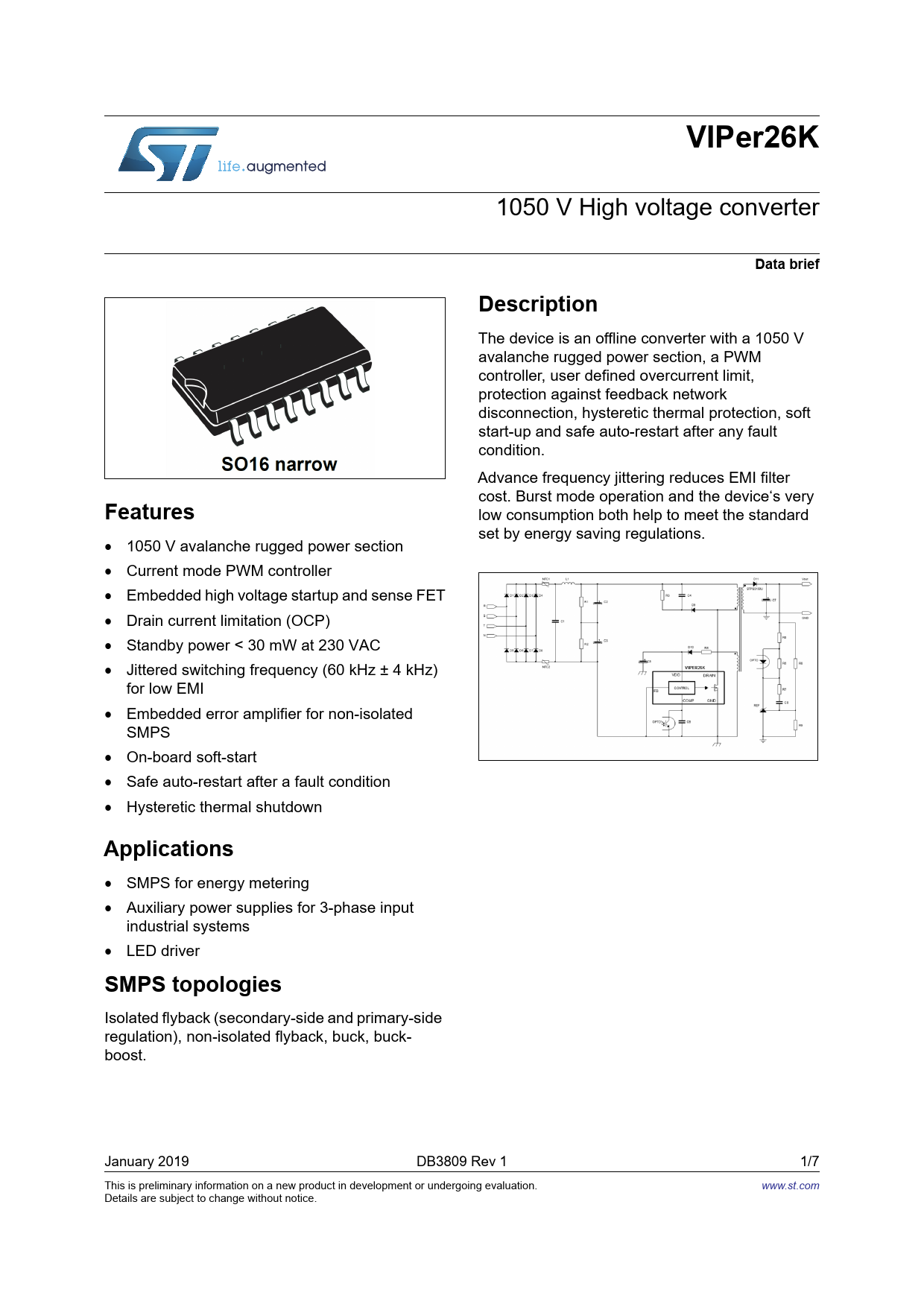 VIPer26K 1050 V High voltage converter Data briefDescription The device is an offline converter with a 1050 V avalanche rugged power section, a PWM controller, user defined overcurrent limit, protection against feedback network disconnection, hysteretic thermal protection, soft start-up and safe auto-restart after any fault condition. Advance frequency jittering reduces EMI filter cost. Burst mode operation and the device‘s very Features low consumption both help to meet the standard set by energy saving regulations. 1050 V avalanche rugged power section Current mode PWM controller Embedded high voltage startup and sense FET Drain current limitation (OCP) Standby power < 30 mW at 230 VAC Jittered switching frequency (60 kHz ± 4 kHz) for low EMI Embedded error amplifier for non-isolated SMPS On-board soft-start Safe auto-restart after a fault condition Hysteretic thermal shutdown Applications SMPS for energy metering Auxiliary power supplies for 3-phase input industrial systems LED driver SMPS topologies Isolated flyback (secondary-side and primary-side regulation), non-isolated flyback, buck, buck- boost. January 2019 DB3809 Rev 1 1/7 This is preliminary information on a new product in development or undergoing evaluation. www.st.com Details are subject to change without notice. Document Outline 1 Pin description Figure 1. Connection diagram Table 1. Pin description 2 Electrical characteristics Table 2. Electrical and thermal characteristics Figure 2. Typical isolated flyback configuration with secondary regulation Figure 3. Typical isolated flyback configuration with primary regulation Figure 4. Typical non-isolated flyback configuration 3 Ordering information Table 3. Order codes 4 Revision history Table 4. Document revision history
