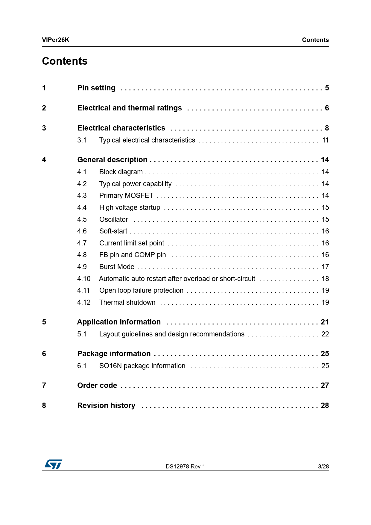 link to page 4 link to page 5 link to page 10 link to page 13 link to page 13 link to page 13 link to page 14 link to page 15 link to page 15 link to page 15 link to page 15 link to page 17 link to page 17 link to page 18 link to page 18 link to page 20 link to page 22 link to page 24 link to page 24 link to page 27 VIPer26KContentsContents1Pin setting . 52Electrical and thermal ratings . 63Electrical characteristics . 8 3.1 Typical electrical characteristics . 11 4General description . 14 4.1 Block diagram . 14 4.2 Typical power capability . 14 4.3 Primary MOSFET . 14 4.4 High voltage startup . 15 4.5 Oscillator . 15 4.6 Soft-start . 16 4.7 Current limit set point . 16 4.8 FB pin and COMP pin . 16 4.9 Burst Mode . 17 4.10 Automatic auto restart after overload or short-circuit . 18 4.11 Open loop failure protection . 19 4.12 Thermal shutdown . 19 5Application information . 21 5.1 Layout guidelines and design recommendations . 22 6Package information . 25 6.1 SO16N package information . 25 7Order code . 278Revision history . 28 DS12978 Rev 1 3/28 28 Document Outline Figure 1. Basic application schematic 1 Pin setting Figure 2. Connection diagram Table 1. Pin description 2 Electrical and thermal ratings Table 2. Absolute maximum ratings Table 3. Thermal data Figure 3. RthJA Table 4. Avalanche characteristics 3 Electrical characteristics Table 5. Power section Table 6. Supply section Table 7. Controller section 3.1 Typical electrical characteristics Figure 4. IDLIM vs. Tj Figure 5. FOSC vs. Tj Figure 6. VHV_START vs. Tj Figure 7. VREF_FB vs. Tj Figure 8. IDD0 vs. Tj Figure 9. IDD1 vs. Tj Figure 10. GM vs. Tj Figure 11. HCOMP vs. Tj Figure 12. ICOMP(source/sink) vs. Tj Figure 13. ICOMP(max source) vs. Tj Figure 14. Power MOSFET capacitances variation vs. VDS @ VGS=0, f=1MHz Figure 15. VBVDSS vs. TJ .. Figure 16. RDS(on) vs. Tj Figure 17. Maximum avalanche energy vs. Tj Figure 18. SOA SSOP10 package 4 General description 4.1 Block diagram Figure 19. Block diagram 4.2 Typical power capability Table 8. Typical power 4.3 Primary MOSFET 4.4 High voltage startup Figure 20. Timing diagram: normal power-up and power-down sequences 4.5 Oscillator 4.6 Soft-start 4.7 Current limit set point 4.8 FB pin and COMP pin Figure 21. Feedback circuit Figure 22. COMP pin vs. IDLIM 4.9 Burst mode Figure 23. Load-dependent operating modes: timing diagram 4.10 Automatic auto restart after overload or short-circuit Figure 24. Timing diagram: OLP sequence 4.11 Open loop failure protection 4.12 Thermal shutdown Figure 25. Timing diagram: OLP sequence 5 Application information Figure 26. Typical isolated flyback configuration with secondary regulation Figure 27. Typical isolated flyback configuration with primary regulation Figure 28. Typical non isolated flyback configuration Figure 29. Ultra wide range Buck configuration 5.1 Layout guidelines and design recommendations Figure 30. Recommended routing for flyback converter Figure 31. Recommended routing for Buck converter 6 Package information 6.1 SO16N package information Figure 32. SO16N package outline Table 9. SO16N mechanical data 7 Order code Table 10. Order codes 8 Revision history Table 11. Document history