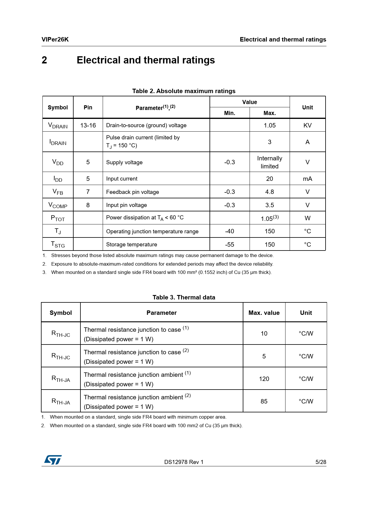 VIPer26KElectrical and thermal ratings2Electrical and thermal ratingsTable 2. Absolute maximum ratingsValueSymbolPinParameter(1),(2)UnitMin.Max. VDRAIN 13-16 Drain-to-source (ground) voltage 1.05 KV Pulse drain current (limited by IDRAIN 3 A TJ = 150 °C) V Internally DD 5 Supply voltage -0.3 V limited IDD 5 Input current 20 mA VFB 7 Feedback pin voltage -0.3 4.8 V VCOMP 8 Input pin voltage -0.3 3.5 V PTOT Power dissipation at TA < 60 °C 1.05(3) W TJ Operating junction temperature range -40 150 °C TSTG Storage temperature -55 150 °C 1. Stresses beyond those listed absolute maximum ratings may cause permanent damage to the device. 2. Exposure to absolute-maximum-rated conditions for extended periods may affect the device reliability. 3. When mounted on a standard single side FR4 board with 100 mm² (0.1552 inch) of Cu (35 μm thick). Table 3. Thermal dataSymbolParameterMax. valueUnit R Thermal resistance junction to case (1) TH-JC 10 °C/W (Dissipated power = 1 W) R Thermal resistance junction to case (2) TH-JC 5 °C/W (Dissipated power = 1 W) R Thermal resistance junction ambient (1) TH-JA 120 °C/W (Dissipated power = 1 W) R Thermal resistance junction ambient (2) TH-JA 85 °C/W (Dissipated power = 1 W) 1. When mounted on a standard, single side FR4 board with minimum copper area. 2. When mounted on a standard, single side FR4 board with 100 mm2 of Cu (35 μm thick). DS12978 Rev 1 5/28 28 Document Outline Figure 1. Basic application schematic 1 Pin setting Figure 2. Connection diagram Table 1. Pin description 2 Electrical and thermal ratings Table 2. Absolute maximum ratings Table 3. Thermal data Figure 3. RthJA Table 4. Avalanche characteristics 3 Electrical characteristics Table 5. Power section Table 6. Supply section Table 7. Controller section 3.1 Typical electrical characteristics Figure 4. IDLIM vs. Tj Figure 5. FOSC vs. Tj Figure 6. VHV_START vs. Tj Figure 7. VREF_FB vs. Tj Figure 8. IDD0 vs. Tj Figure 9. IDD1 vs. Tj Figure 10. GM vs. Tj Figure 11. HCOMP vs. Tj Figure 12. ICOMP(source/sink) vs. Tj Figure 13. ICOMP(max source) vs. Tj Figure 14. Power MOSFET capacitances variation vs. VDS @ VGS=0, f=1MHz Figure 15. VBVDSS vs. TJ .. Figure 16. RDS(on) vs. Tj Figure 17. Maximum avalanche energy vs. Tj Figure 18. SOA SSOP10 package 4 General description 4.1 Block diagram Figure 19. Block diagram 4.2 Typical power capability Table 8. Typical power 4.3 Primary MOSFET 4.4 High voltage startup Figure 20. Timing diagram: normal power-up and power-down sequences 4.5 Oscillator 4.6 Soft-start 4.7 Current limit set point 4.8 FB pin and COMP pin Figure 21. Feedback circuit Figure 22. COMP pin vs. IDLIM 4.9 Burst mode Figure 23. Load-dependent operating modes: timing diagram 4.10 Automatic auto restart after overload or short-circuit Figure 24. Timing diagram: OLP sequence 4.11 Open loop failure protection 4.12 Thermal shutdown Figure 25. Timing diagram: OLP sequence 5 Application information Figure 26. Typical isolated flyback configuration with secondary regulation Figure 27. Typical isolated flyback configuration with primary regulation Figure 28. Typical non isolated flyback configuration Figure 29. Ultra wide range Buck configuration 5.1 Layout guidelines and design recommendations Figure 30. Recommended routing for flyback converter Figure 31. Recommended routing for Buck converter 6 Package information 6.1 SO16N package information Figure 32. SO16N package outline Table 9. SO16N mechanical data 7 Order code Table 10. Order codes 8 Revision history Table 11. Document history