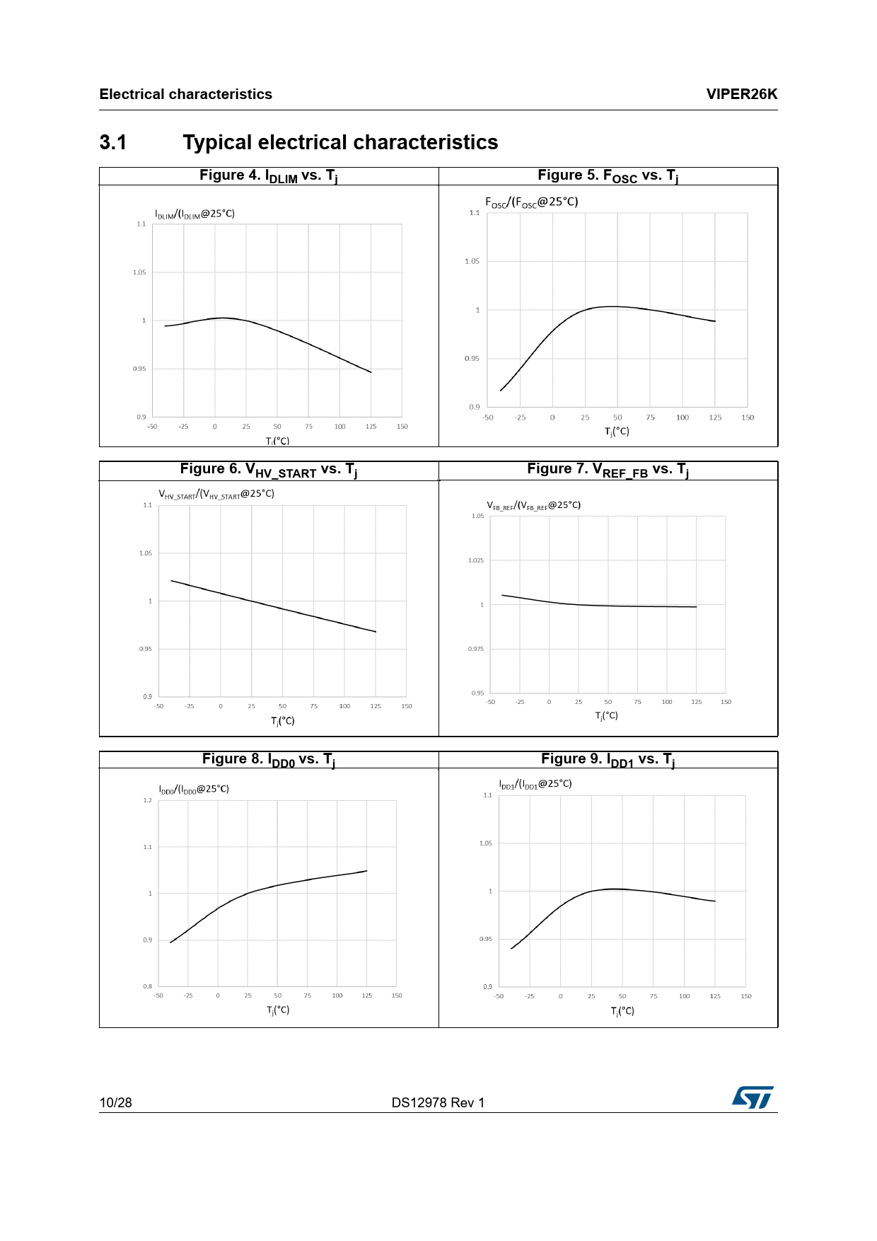 Electrical characteristics VIPER26K 3.1 Typical electrical characteristics Figure 4. I DLIM vs. Tj Figure 5. FOSC vs. Tj Figure 6. VHV_START vs. Tj Figure 7. VREF_FB vs. Tj Figure 8. IDD0 vs. Tj Figure 9. IDD1 vs. Tj