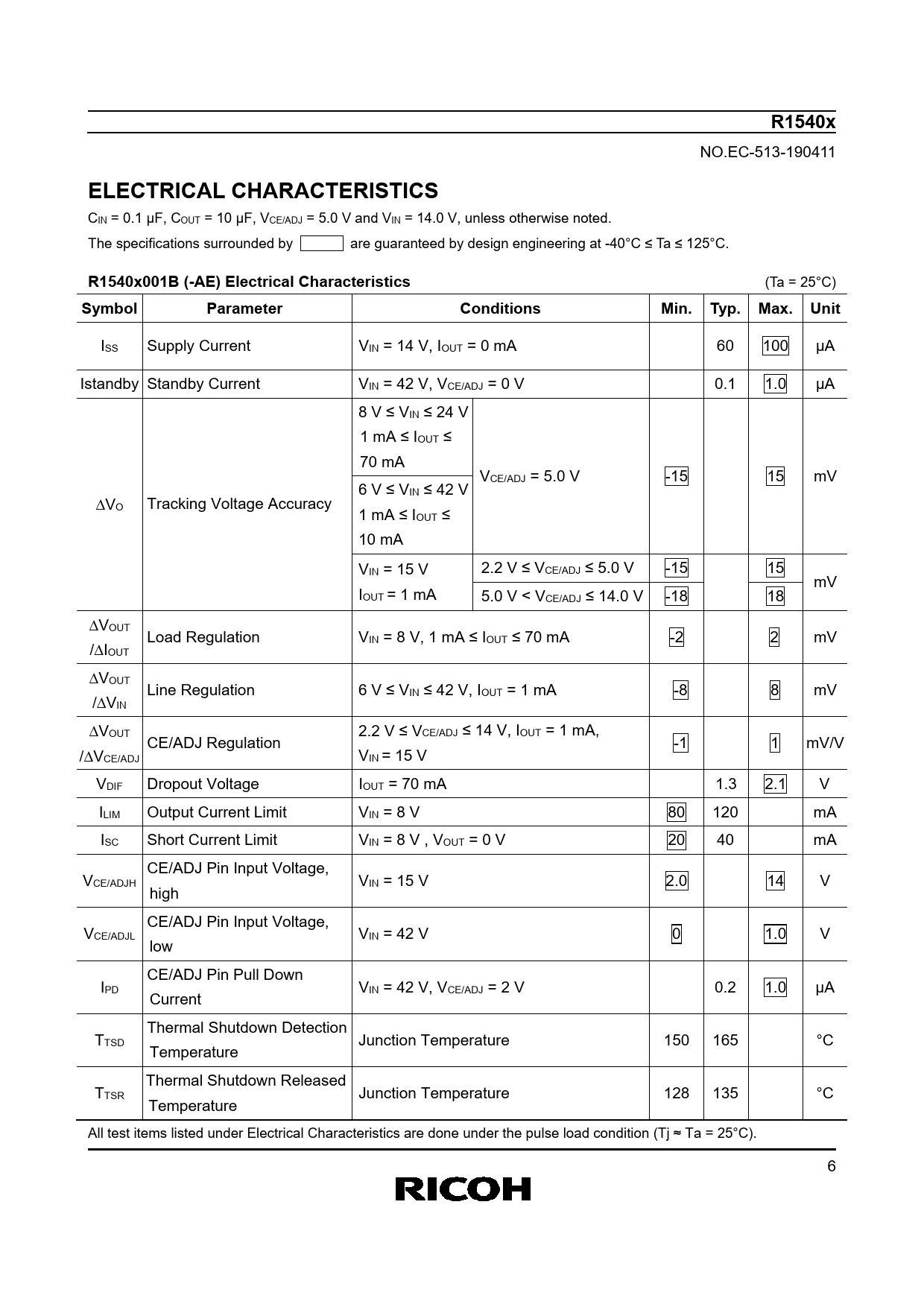 R1540x NO.EC-513-190411 ELECTRICAL CHARACTERISTICS CIN = 0.1 μF, COUT = 10 μF, VCE/ADJ = 5.0 V and VIN = 14.0 V, unless otherwise noted. The specifications surrounded by are guaranteed by design engineering at -40°C ≤ Ta ≤ 125°C. R1540x001B (-AE) Electrical Characteristics (Ta = 25°C) SymbolParameterConditionsMin. Typ. Max.Unit ISS Supply Current VIN = 14 V, IOUT = 0 mA 60 100 μA Istandby Standby Current VIN = 42 V, VCE/ADJ = 0 V 0.1 1.0 μA 8 V ≤ VIN ≤ 24 V 1 mA ≤ IOUT ≤ 70 mA VCE/ADJ = 5.0 V -15 15 mV 6 V ≤ VIN ≤ 42 V VO Tracking Voltage Accuracy 1 mA ≤ IOUT ≤ 10 mA VIN = 15 V 2.2 V ≤ VCE/ADJ ≤ 5.0 V -15 15 mV IOUT = 1 mA 5.0 V < VCE/ADJ ≤ 14.0 V -18 18 VOUT Load Regulation VIN = 8 V, 1 mA ≤ IOUT ≤ 70 mA -2 2 mV /IOUT VOUT Line Regulation 6 V ≤ VIN ≤ 42 V, IOUT = 1 mA -8 8 mV /VIN VOUT 2.2 V ≤ VCE/ADJ ≤ 14 V, IOUT = 1 mA, CE/ADJ Regulation -1 1 mV/V /VCE/ADJ VIN = 15 V VDIF Dropout Voltage IOUT = 70 mA 1.3 2.1 V ILIM Output Current Limit VIN = 8 V 80 120 mA ISC Short Current Limit VIN = 8 V , VOUT = 0 V 20 40 mA CE/ADJ Pin Input Voltage, VCE/ADJH VIN = 15 V 2.0 14 V high CE/ADJ Pin Input Voltage, VCE/ADJL VIN = 42 V 0 1.0 V low CE/ADJ Pin Pull Down IPD VIN = 42 V, VCE/ADJ = 2 V 0.2 1.0 μA Current Thermal Shutdown Detection TTSD Junction Temperature 150 165 °C Temperature Thermal Shutdown Released TTSR Junction Temperature 128 135 °C Temperature All test items listed under Electrical Characteristics are done under the pulse load condition (Tj ≈ Ta = 25°C). 6