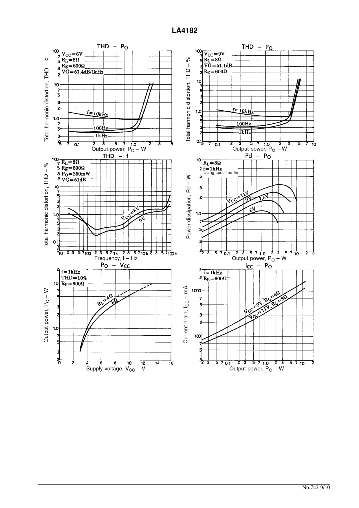 % % – – THD THD distortion, distortion, harmonic harmonic otal T otal T Output power, PO – W Output power, PO – W % – Using specified fin W THD – Pd distortion, dissipation, harmonic Power otal T Frequency, f – Hz Output power, PO – W A –W –m OP, I CC power drain, Output Current Supply voltage, VCC – V Output power, PO – W No.742-9/10