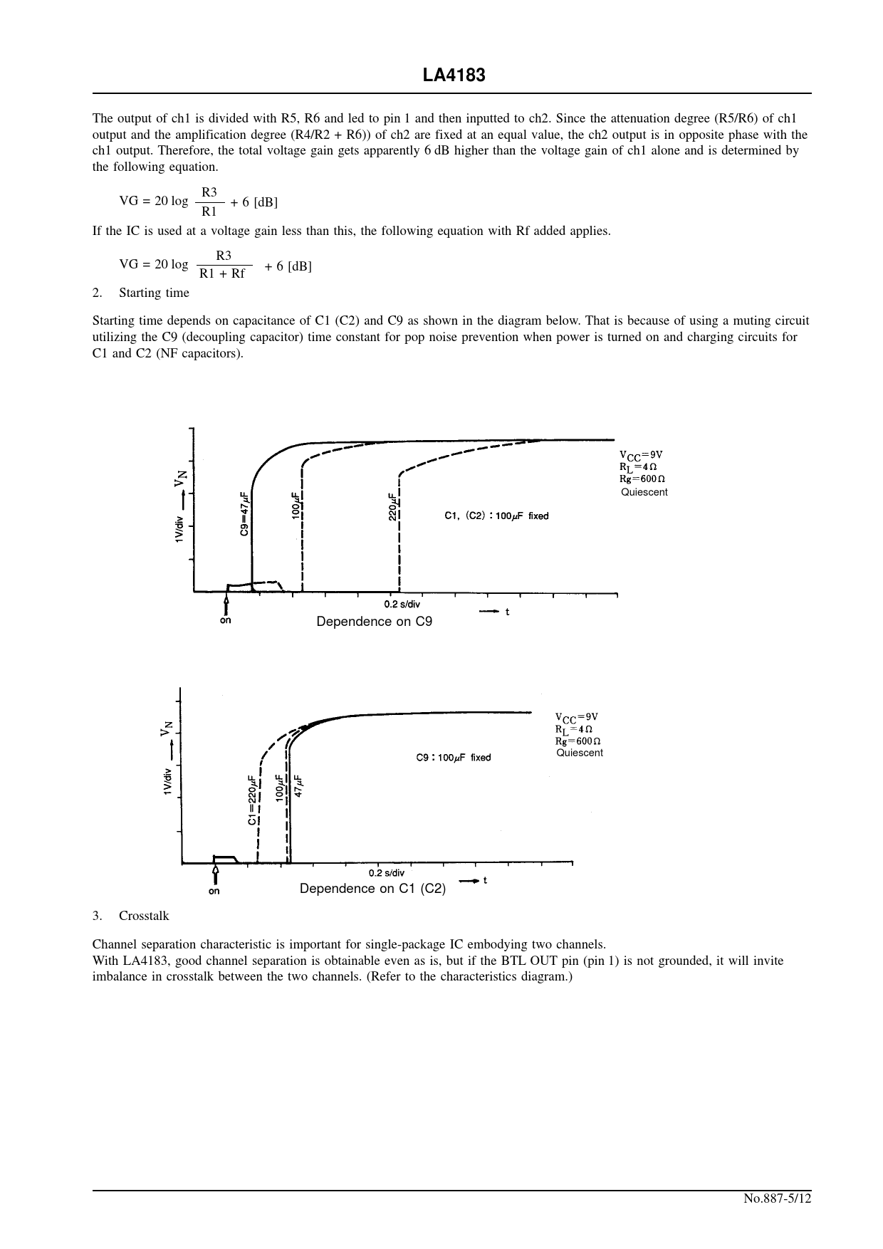LA4183 The output of ch1 is divided with R5, R6 and led to pin 1 and then inputted to ch2. Since the attenuation degree (R5/R6) of ch1 output and the amplification degree (R4/R2 + R6)) of ch2 are fixed at an equal value, the ch2 output is in opposite phase with the ch1 output. Therefore, the total voltage gain gets apparently 6 dB higher than the voltage gain of ch1 alone and is determined by the following equation. R3 VG = 20 log + 6 [dB] R1 If the IC is used at a voltage gain less than this, the following equation with Rf added applies. R3 VG = 20 log + 6 [dB] R1 + Rf 2. Starting time Starting time depends on capacitance of C1 (C2) and C9 as shown in the diagram below. That is because of using a muting circuit utilizing the C9 (decoupling capacitor) time constant for pop noise prevention when power is turned on and charging circuits for C1 and C2 (NF capacitors). Quiescent Dependence on C9 Quiescent Dependence on C1 (C2) 3. Crosstalk Channel separation characteristic is important for single-package IC embodying two channels. With LA4183, good channel separation is obtainable even as is, but if the BTL OUT pin (pin 1) is not grounded, it will invite imbalance in crosstalk between the two channels. (Refer to the characteristics diagram.) No.887-5/12