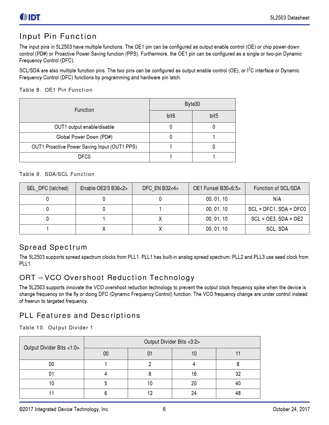 Input Pin Function. Table 8. OE1 Pin Function. Byte30. Function. bit6. bit5. Table 9. SDA/SCL Function. SEL_DFC (latched)