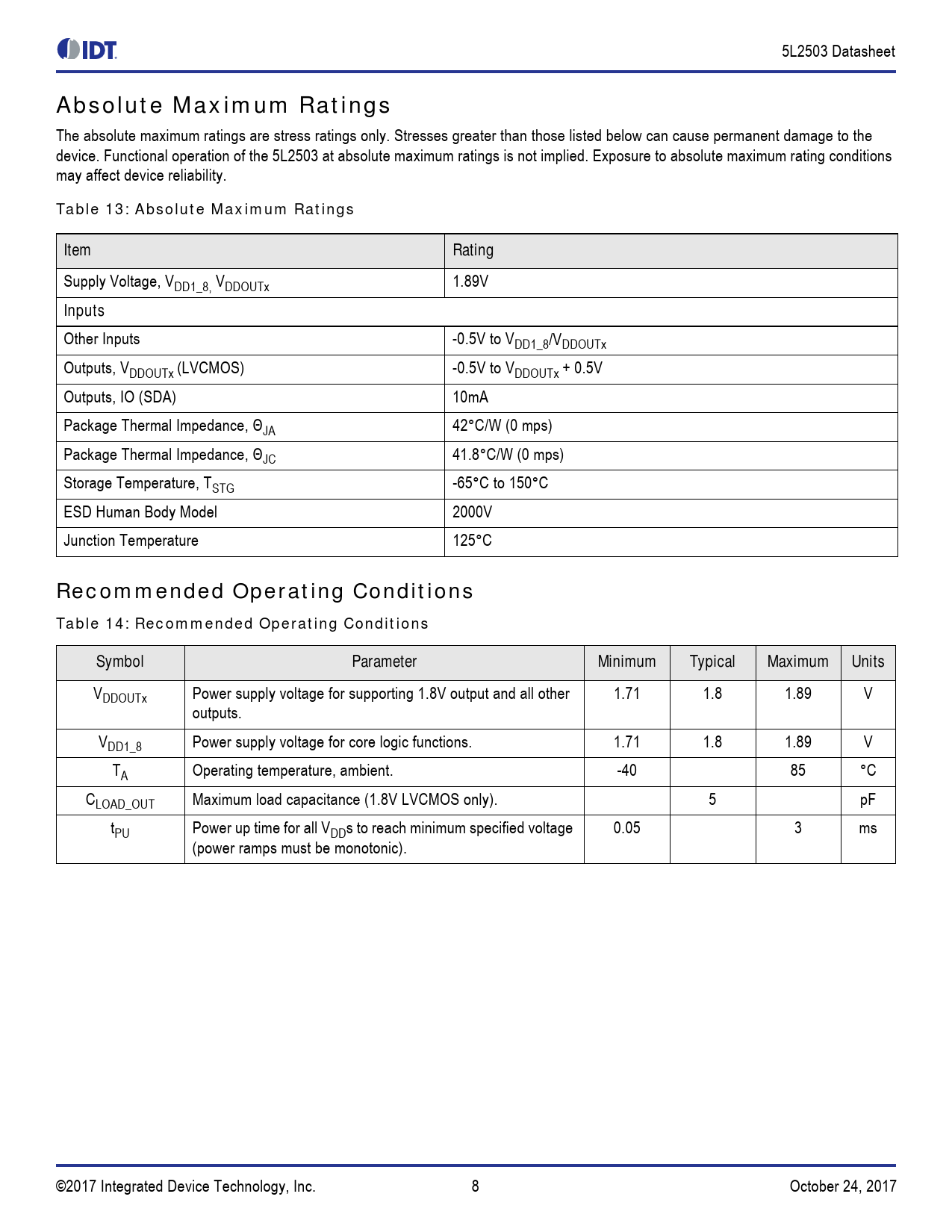 Other Inputs -0.5V to VDD1_8/VDDOUTx Outputs, VDDOUTx (LVCMOS) -0.5V to VDDOUTx + 0.5V Outputs, IO (SDA) 10mA Package Thermal Impedance, ΘJA 42°C/W (0 mps) Package Thermal Impedance, ΘJC 41.8°C/W (0 mps) Storage Temperature, TSTG -65°C to 150°C ESD Human Body Model 2000V Junction Temperature 125°C