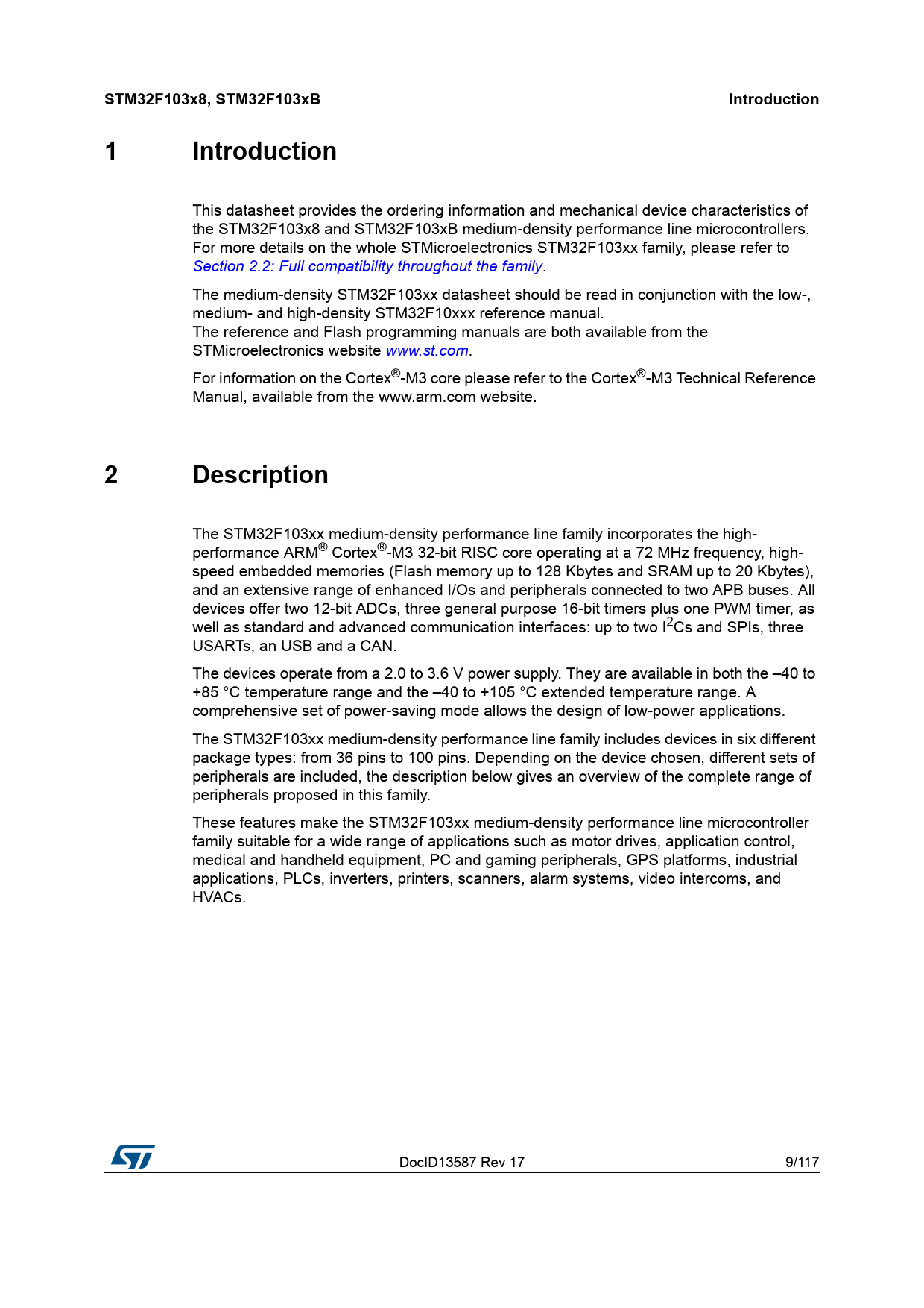 link to page 117 link to page 13 STM32F103x8, STM32F103xBIntroduction1 Introduction This datasheet provides the ordering information and mechanical device characteristics of the STM32F103x8 and STM32F103xB medium-density performance line microcontrollers. For more details on the whole STMicroelectronics STM32F103xx family, please refer to Section 2.2: Full compatibility throughout the family. The medium-density STM32F103xx datasheet should be read in conjunction with the low-, medium- and high-density STM32F10xxx reference manual. The reference and Flash programming manuals are both available from the STMicroelectronics website www.st.com. For information on the Cortex®-M3 core please refer to the Cortex®-M3 Technical Reference Manual, available from the www.arm.com website. 2 Description The STM32F103xx medium-density performance line family incorporates the high- performance ARM® Cortex®-M3 32-bit RISC core operating at a 72 MHz frequency, high- speed embedded memories (Flash memory up to 128 Kbytes and SRAM up to 20 Kbytes), and an extensive range of enhanced I/Os and peripherals connected to two APB buses. All devices offer two 12-bit ADCs, three general purpose 16-bit timers plus one PWM timer, as well as standard and advanced communication interfaces: up to two I2Cs and SPIs, three USARTs, an USB and a CAN. The devices operate from a 2.0 to 3.6 V power supply. They are available in both the –40 to +85 °C temperature range and the –40 to +105 °C extended temperature range. A comprehensive set of power-saving mode allows the design of low-power applications. The STM32F103xx medium-density performance line family includes devices in six different package types: from 36 pins to 100 pins. Depending on the device chosen, different sets of peripherals are included, the description below gives an overview of the complete range of peripherals proposed in this family. These features make the STM32F103xx medium-density performance line microcontroller family suitable for a wide range of applications such as motor drives, application control, medical and handheld equipment, PC and gaming peripherals, GPS platforms, industrial applications, PLCs, inverters, printers, scanners, alarm systems, video intercoms, and HVACs. DocID13587 Rev 17 9/117 116 Document Outline Table 1. Device summary 1 Introduction 2 Description 2.1 Device overview Table 2. STM32F103xx medium-density device features and peripheral counts Figure 1. STM32F103xx performance line block diagram Figure 2. Clock tree 2.2 Full compatibility throughout the family Table 3. STM32F103xx family 2.3 Overview 2.3.1 ARM® Cortex®-M3 core with embedded Flash and SRAM 2.3.2 Embedded Flash memory 2.3.3 CRC (cyclic redundancy check) calculation unit 2.3.4 Embedded SRAM 2.3.5 Nested vectored interrupt controller (NVIC) 2.3.6 External interrupt/event controller (EXTI) 2.3.7 Clocks and startup 2.3.8 Boot modes 2.3.9 Power supply schemes 2.3.10 Power supply supervisor 2.3.11 Voltage regulator 2.3.12 Low-power modes 2.3.13 DMA 2.3.14 RTC (real-time clock) and backup registers 2.3.15 Timers and watchdogs Table 4. Timer feature comparison 2.3.16 I²C bus 2.3.17 Universal synchronous/asynchronous receiver transmitter (USART) 2.3.18 Serial peripheral interface (SPI) 2.3.19 Controller area network (CAN) 2.3.20 Universal serial bus (USB) 2.3.21 GPIOs (general-purpose inputs/outputs) 2.3.22 ADC (analog-to-digital converter) 2.3.23 Temperature sensor 2.3.24 Serial wire JTAG debug port (SWJ-DP) 3 Pinouts and pin description Figure 3. STM32F103xx performance line LFBGA100 ballout Figure 4. STM32F103xx performance line LQFP100 pinout Figure 5. STM32F103xx performance line UFBGA100 pinout Figure 6. STM32F103xx performance line LQFP64 pinout Figure 7. STM32F103xx performance line TFBGA64 ballout Figure 8. STM32F103xx performance line LQFP48 pinout Figure 9. STM32F103xx performance line UFQFPN48 pinout Figure 10. STM32F103xx performance line VFQFPN36 pinout Table 5. Medium-density STM32F103xx pin definitions 4 Memory mapping Figure 11. Memory map 5 Electrical characteristics 5.1 Parameter conditions 5.1.1 Minimum and maximum values 5.1.2 Typical values 5.1.3 Typical curves 5.1.4 Loading capacitor 5.1.5 Pin input voltage Figure 12. Pin loading conditions Figure 13. Pin input voltage 5.1.6 Power supply scheme Figure 14. Power supply scheme 5.1.7 Current consumption measurement Figure 15. Current consumption measurement scheme 5.2 Absolute maximum ratings Table 6. Voltage characteristics Table 7. Current characteristics Table 8. Thermal characteristics 5.3 Operating conditions 5.3.1 General operating conditions Table 9. General operating conditions 5.3.2 Operating conditions at power-up / power-down Table 10. Operating conditions at power-up / power-down 5.3.3 Embedded reset and power control block characteristics Table 11. Embedded reset and power control block characteristics 5.3.4 Embedded reference voltage Table 12. Embedded internal reference voltage 5.3.5 Supply current characteristics Table 13. Maximum current consumption in Run mode, code with data processing running from Flash Table 14. Maximum current consumption in Run mode, code with data processing running from RAM Figure 16. Typical current consumption in Run mode versus frequency (at 3.6 V) - code with data processing running from RAM, peripherals enabled Figure 17. Typical current consumption in Run mode versus frequency (at 3.6 V) - code with data processing running from RAM, peripherals disabled Table 15. Maximum current consumption in Sleep mode, code running from Flash or RAM Table 16. Typical and maximum current consumptions in Stop and Standby modes Figure 18. Typical current consumption on VBAT with RTC on versus temperature at different VBAT values Figure 19. Typical current consumption in Stop mode with regulator in Run mode versus temperature at VDD = 3.3 V and 3.6 V Figure 20. Typical current consumption in Stop mode with regulator in Low-power mode versus temperature at VDD = 3