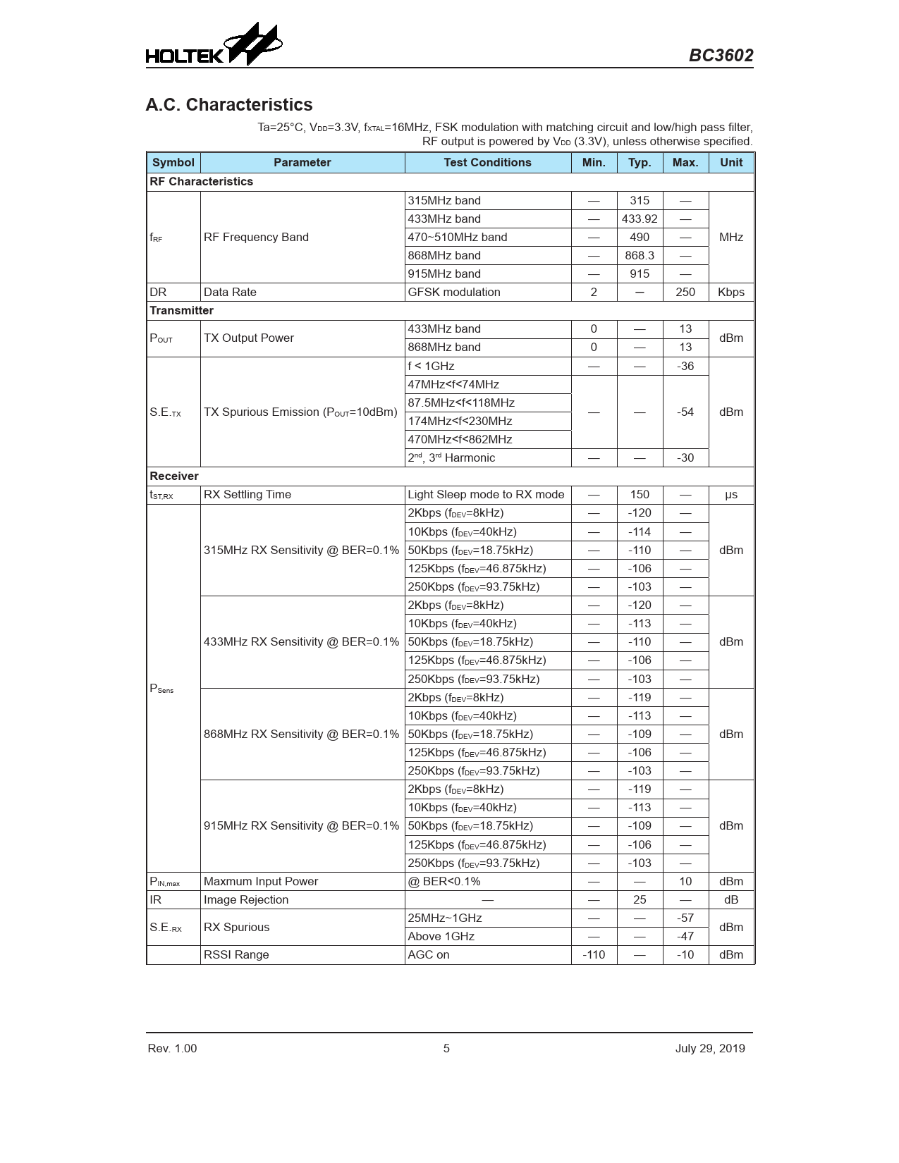 BC3602. A.C. Characteristics. Symbol. Parameter. Test Conditions. Min. Typ. Max. Unit. RF Characteristics. Transmitter. Receiver