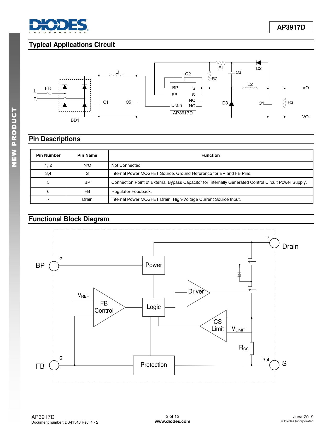 7 Drain 5 BP Power Driver VREF FB Logic Control CS Limit VLIMIT RCS 6 3,4 Protection FB S AP3917D 2 of 12 June 2019 Document number: DS41540 Rev. 4 - 2