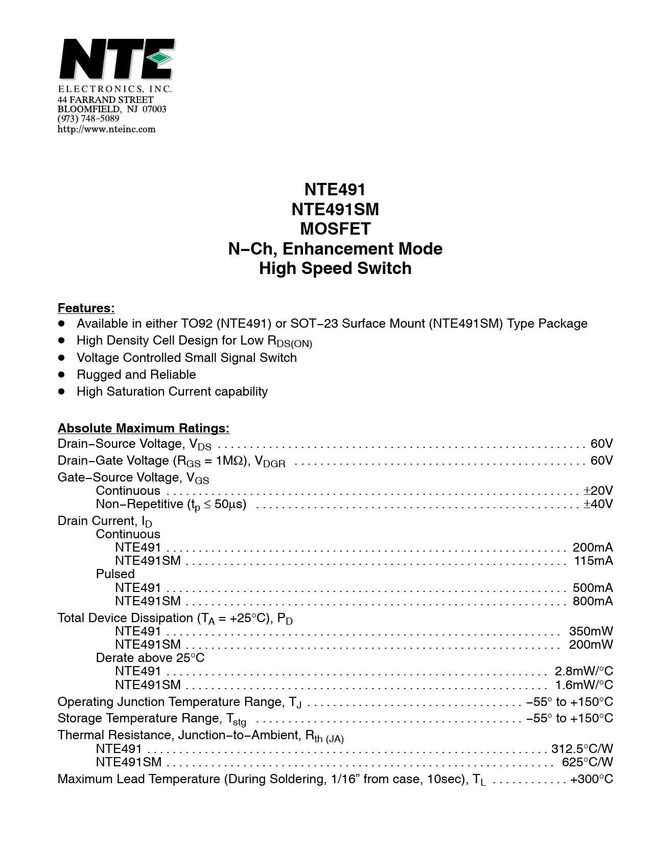 NTE491NTE491SMMOSFETN−Ch, Enhancement ModeHigh Speed SwitchFeatures: D Available in either TO92 (NTE491) or SOT−23 Surface Mount (NTE491SM) Type Package D High Density Cell Design for Low RDS(ON) D Voltage Controlled Small Signal Switch D Rugged and Reliable D High Saturation Current capability Absolute Maximum Ratings: Drain−Source Voltage, VDS . 60V Drain−Gate Voltage (RGS = 1MΩ), VDGR . 60V Gate−Source Voltage, VGS Continuous . ±20V Non−Repetitive (tp ≤ 50µs) . ±40V Drain Current, ID Continuous NTE491 . 200mA NTE491SM . 115mA Pulsed NTE491 . 500mA NTE491SM . 800mA Total Device Dissipation (TA = +25°C), PD NTE491 . 350mW NTE491SM . 200mW Derate above 25°C NTE491 . 2.8mW/°C NTE491SM . 1.6mW/°C Operating Junction Temperature Range, TJ . −55° to +150°C Storage Temperature Range, Tstg . −55° to +150°C Thermal Resistance, Junction−to−Ambient, Rth (JA) NTE491 . 312.5°C/W NTE491SM . 625°C/W Maximum Lead Temperature (During Soldering, 1/16” from case, 10sec), TL . +300°C