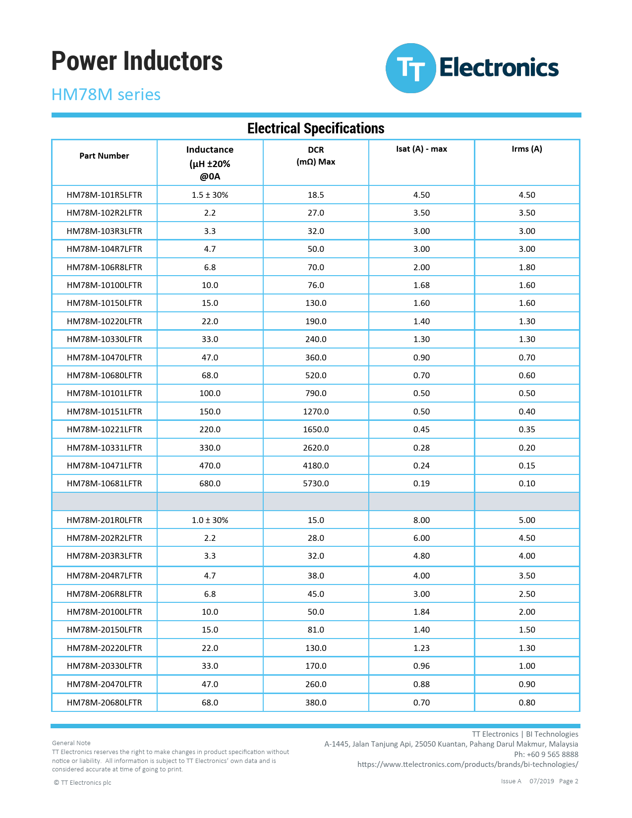 HM78M-101R5LFTR 1.5 ± 30% 18.5 4.50 4.50 HM78M-102R2LFTR 2.2 27.0 3.50 3.50 HM78M-103R3LFTR 3.3 32.0 3.00 3.00 HM78M-104R7LFTR 4.7 50.0 3.00 3.00 HM78M-106R8LFTR 6.8 70.0 2.00 1.80 HM78M-10100LFTR 10.0 76.0 1.68 1.60 HM78M-10150LFTR 15.0 130.0 1.60 1.60 HM78M-10220LFTR 22.0 190.0 1.40 1.30 HM78M-10330LFTR 33.0 240.0 1.30 1.30 HM78M-10470LFTR 47.0 360.0 0.90 0.70 HM78M-10680LFTR 68.0 520.0 0.70 0.60 HM78M-10101LFTR 100.0 790.0 0.50 0.50 HM78M-10151LFTR 150.0 1270.0 0.50 0.40 HM78M-10221LFTR 220.0 1650.0 0.45 0.35 HM78M-10331LFTR 330.0 2620.0 0.28 0.20 HM78M-10471LFTR 470.0 4180.0 0.24 0.15 HM78M-10681LFTR 680.0 5730.0 0.19 0.10 HM78M-201R0LFTR 1.0 ± 30% 15.0 8.00 5.00 HM78M-202R2LFTR 2.2 28.0 6.00 4.50 HM78M-203R3LFTR 3.3 32.0 4.80 4.00 HM78M-204R7LFTR 4.7 38.0 4.00 3.50 HM78M-206R8LFTR 6.8 45.0 3.00 2.50 HM78M-20100LFTR 10.0 50.0 1.84 2.00 HM78M-20150LFTR 15.0 81.0 1.40 1.50 HM78M-20220LFTR 22.0 130.0 1.23 1.30 HM78M-20330LFTR 33.0 170.0 0.96 1.00 HM78M-20470LFTR 47.0 260.0 0.88 0.90 HM78M-20680LFTR 68.0 380.0 0.70 0.80 TT Electronics | BI Technologies General Note A-1445, Jalan Tanjung Api, 25050 Kuantan, Pahang Darul Makmur, Malaysia TT Electronics reserves the right to make changes in product specification without Ph: +60 9 565 8888 notice or liability. All information is subject to TT Electronics’ own data and is https://www.ttelectronics.com/products/brands/bi-technologies/ considered accurate at time of going to print. © TT Electronics plc Issue A 07/2019 Page 2