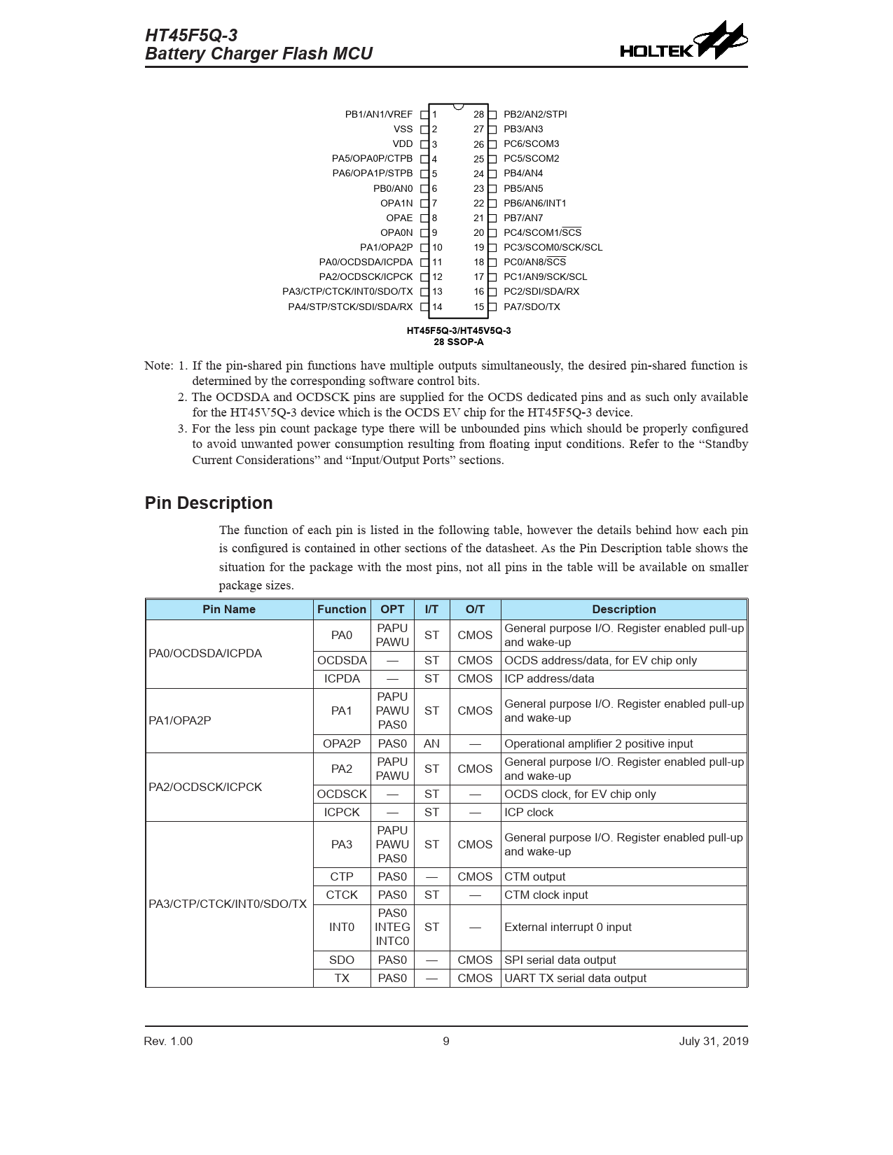 HT45F5Q-3 Battery Charger Flash MCU HT45F5Q-3/HT45V5Q-3 28 SSOP-A Pin Description Pin Name Function OPT I/T O/T Description