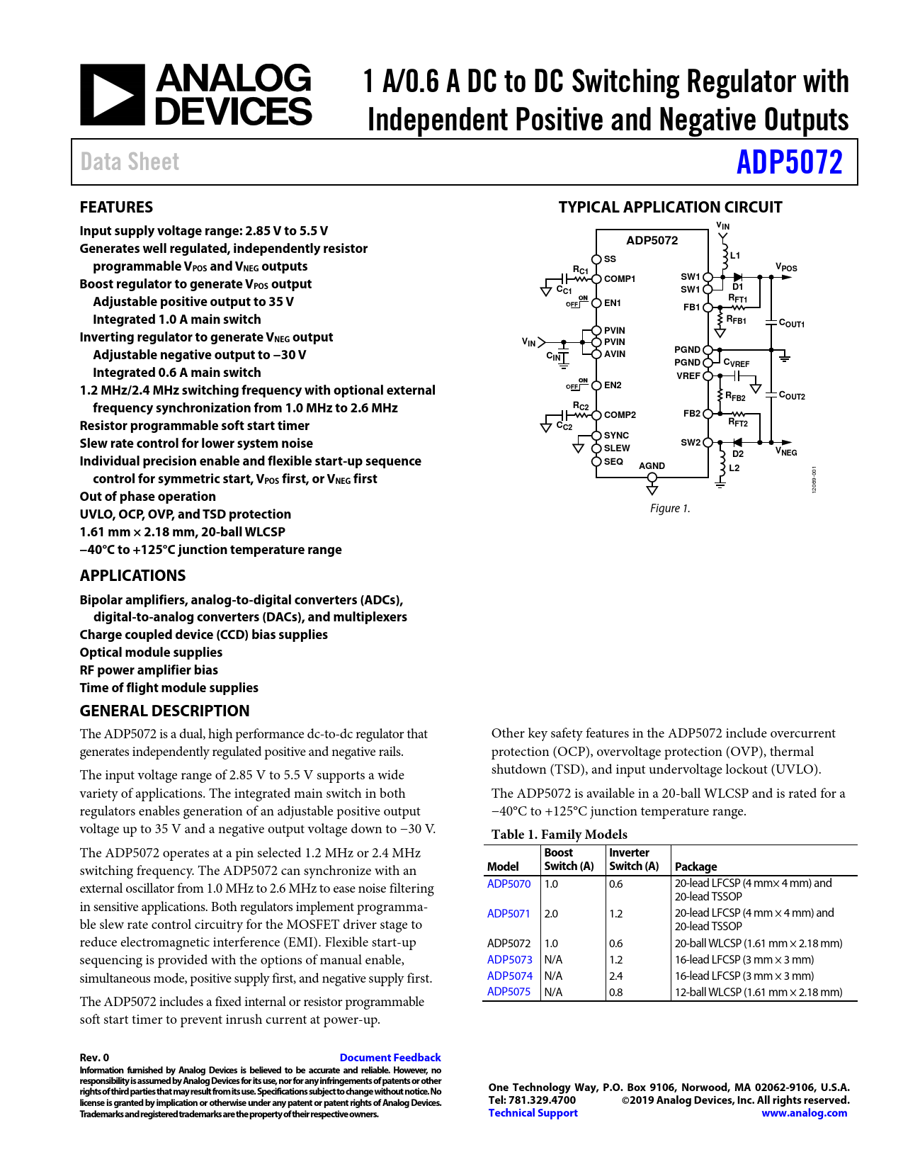 1 A/0.6 A DC to DC Switching Regulator with. Independent Positive and Negative Outputs. Data Sheet. ADP5072. FEATURES
