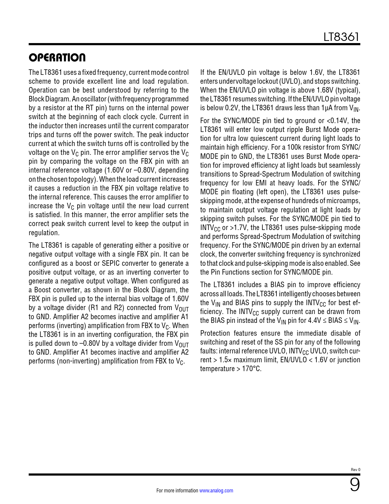 The LT8361 uses a fixed frequency, current mode control If the EN/UVLO pin voltage is below 1.6V, the LT8361 scheme to provide excellent line and load regulation. enters undervoltage lockout (UVLO), and stops switching. Operation can be best understood by referring to the When the EN/UVLO pin voltage is above 1.68V (typical), Block Diagram. An oscillator (with frequency programmed the LT8361 resumes switching. If the EN/UVLO pin voltage by a resistor at the RT pin) turns on the internal power is below 0.2V, the LT8361 draws less than 1µA from VIN. switch at the beginning of each clock cycle. Current in For the SYNC/MODE pin tied to ground or <0.14V, the the inductor then increases until the current comparator LT8361 will enter low output ripple Burst Mode opera- trips and turns off the power switch. The peak inductor tion for ultra low quiescent current during light loads to current at which the switch turns off is controlled by the maintain high efficiency. For a 100k resistor from SYNC/ voltage on the VC pin. The error amplifier servos the VC MODE pin to GND, the LT8361 uses Burst Mode opera- pin by comparing the voltage on the FBX pin with an tion for improved efficiency at light loads but seamlessly internal reference voltage (1.60V or –0.80V, depending transitions to Spread-Spectrum Modulation of switching on the chosen topology). When the load current increases frequency for low EMI at heavy loads. For the SYNC/ it causes a reduction in the FBX pin voltage relative to MODE pin floating (left open), the LT8361 uses pulse- the internal reference. This causes the error amplifier to skipping mode, at the expense of hundreds of microamps, increase the VC pin voltage until the new load current to maintain output voltage regulation at light loads by is satisfied. In this manner, the error amplifier sets the skipping switch pulses. For the SYNC/MODE pin tied to correct peak switch current level to keep the output in INTV regulation. CC or >1.7V, the LT8361 uses pulse-skipping mode and performs Spread-Spectrum Modulation of switching The LT8361 is capable of generating either a positive or frequency. For the SYNC/MODE pin driven by an external negative output voltage with a single FBX pin. It can be clock, the converter switching frequency is synchronized configured as a boost or SEPIC converter to generate a to that clock and pulse-skipping mode is also enabled. See positive output voltage, or as an inverting converter to the Pin Functions section for SYNC/MODE pin. generate a negative output voltage. When configured as The LT8361 includes a BIAS pin to improve efficiency a Boost converter, as shown in the Block Diagram, the across all loads. The LT8361 intelligently chooses between FBX pin is pulled up to the internal bias voltage of 1.60V the V by a voltage divider (R1 and R2) connected from V IN and BIAS pins to supply the INTVCC for best ef- OUT ficiency. The INTV to GND. Amplifier A2 becomes inactive and amplifier A1 CC supply current can be drawn from the BIAS pin instead of the V performs (inverting) amplification from FBX to V IN pin for 4.4V ≤ BIAS ≤ VIN. C. When the LT8361 is in an inverting configuration, the FBX pin Protection features ensure the immediate disable of is pulled down to –0.80V by a voltage divider from VOUT switching and reset of the SS pin for any of the following to GND. Amplifier A1 becomes inactive and amplifier A2 faults: internal reference UVLO, INTVCC UVLO, switch cur- performs (non-inverting) amplification from FBX to VC. rent > 1.5× maximum limit, EN/UVLO < 1.6V or junction temperature > 170°C. Rev 0 For more information www.analog.com 9 Document Outline Features Applications Typical Application Description Absolute Maximum Ratings Order Information Pin Configuration Electrical Characteristics Typical Performance Characteristics Pin Functions Block Diagram Operation Applications Information Typical Applications Package Description Typical Application Related Parts