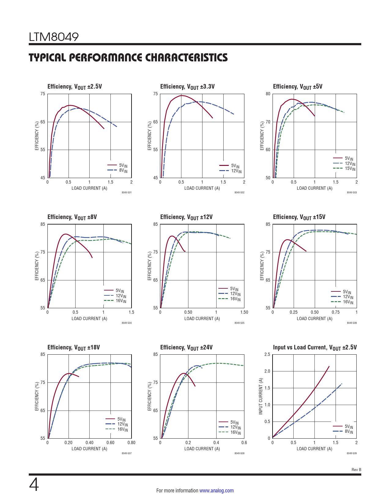 75 75 80 65 65 70 EFFICIENCY (%) 55 EFFICIENCY (%) 55 EFFICIENCY (%) 60 5VIN 5V 12V IN 5V IN IN 8V 15V IN 12V IN IN 45 45 50 0 0.5 1 1.5 2 0 0.5 1 1.5 2 0 0.5 1 1.5 2 LOAD CURRENT (A) LOAD CURRENT (A) LOAD CURRENT (A) 8049 G01 8049 G02 8049 G03