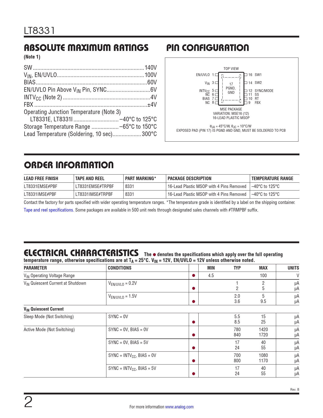 LT8331 ABSOLUTE MAXIMUM RATINGSPIN CONFIGURATION(Note 1) SW ..140V TOP VIEW VIN, EN/UVLO ..100V EN/UVLO 1 16 SW1 BIAS ..60V V 3 IN 14 SW2 17 EN/UVLO Pin Above V IN Pin, SYNC...6V PGND, INTV 5 CC 12 SYNC/MODE GND INTV NC 6 11 SS CC (Note 2) ..4V BIAS 7 10 RT FBX ...±4V NC 8 9 FBX Operating Junction Temperature (Note 3) MSE PACKAGE VARIATION: MSE16 (12) LT8331E, LT8331I .. –40°C to 125°C 16-LEAD PLASTIC MSOP Storage Temperature Range .. –65°C to 150°C θJA = 45°C/W, θJC = 10°C/W Lead Temperature (Soldering, 10 sec) ...300°C EXPOSED PAD (PIN 17) IS PGND AND GND, MUST BE SOLDERED TO PCB ORDER INFORMATION LEAD FREE FINISHTAPE AND REELPART MARKING*PACKAGE DESCRIPTIONTEMPERATURE RANGE LT8331EMSE#PBF LT8331EMSE#TRPBF 8331 16-Lead Plastic MSOP with 4 Pins Removed –40°C to 125°C LT8331IMSE#PBF LT8331IMSE#TRPBF 8331 16-Lead Plastic MSOP with 4 Pins Removed –40°C to 125°C Contact the factory for parts specified with wider operating temperature ranges. *The temperature grade is identified by a label on the shipping container. Tape and reel specifications. Some packages are available in 500 unit reels through designated sales channels with #TRMPBF suffix. ELECTRICAL CHARACTERISTICSThe l denotes the specifications which apply over the full operatingtemperature range, otherwise specifications are at TA = 25°C. VIN = 12V, EN/UVLO = 12V unless otherwise noted. PARAMETERCONDITIONSMINTYPMAXUNITS VIN Operating Voltage Range l 4.5 100 V VIN Quiescent Current at Shutdown VEN/UVLO = 0.2V 1 2 μA l 2 5 μA VEN/UVLO = 1.5V 2.0 5 μA l 3.6 9.5 μA VIN Quiescent Current Sleep Mode (Not Switching) SYNC = 0V 5.5 15 μA l 8.5 25 μA Active Mode (Not Switching) SYNC = 0V, BIAS = 0V 780 1420 µA l 840 1720 µA SYNC = 0V, BIAS = 5V 17 40 µA l 24 55 µA SYNC = INTVCC, BIAS = 0V 700 1080 µA l 800 1170 µA SYNC = INTVCC, BIAS = 5V 17 40 µA l 24 55 µA Rev. B 2 For more information www.analog.com Document Outline Features Applications Typical Application Description Absolute Maximum Ratings Order Information Electrical Characteristics Pin Configuration Electrical Characteristics Typical Performance Characteristics Pin Functions Block Diagram Operation Applications Information Typical Applications Package Description Revision History Typical Application Related Parts