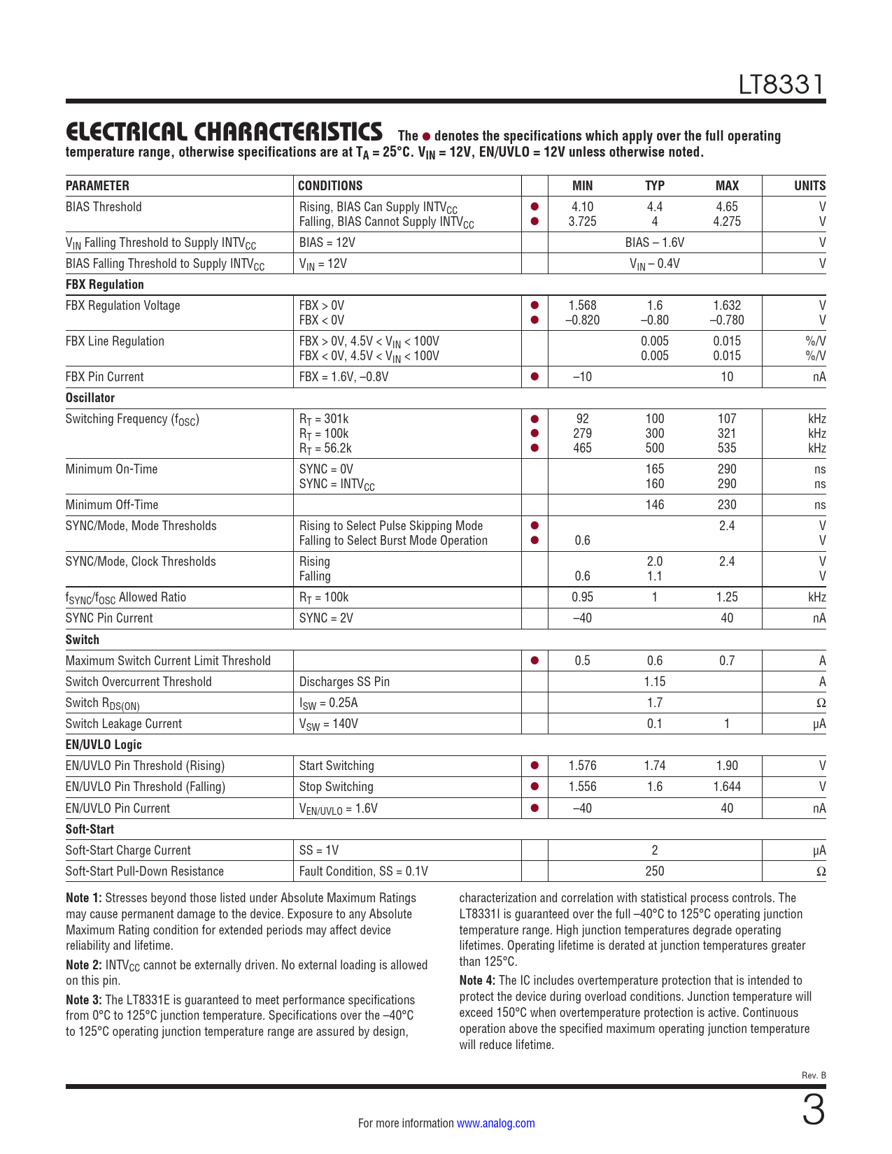 link to page 2 LT8331 ELECTRICAL CHARACTERISTICSThe l denotes the specifications which apply over the full operatingtemperature range, otherwise specifications are at TA = 25°C. VIN = 12V, EN/UVLO = 12V unless otherwise noted.PARAMETERCONDITIONSMINTYPMAXUNITS BIAS Threshold Rising, BIAS Can Supply INTVCC l 4.10 4.4 4.65 V Falling, BIAS Cannot Supply INTVCC l 3.725 4 4.275 V VIN Falling Threshold to Supply INTVCC BIAS = 12V BIAS – 1.6V V BIAS Falling Threshold to Supply INTVCC VIN = 12V VIN – 0.4V V FBX Regulation FBX Regulation Voltage FBX > 0V l 1.568 1.6 1.632 V FBX < 0V l –0.820 –0.80 –0.780 V FBX Line Regulation FBX > 0V, 4.5V < VIN < 100V 0.005 0.015 %/V FBX < 0V, 4.5V < VIN < 100V 0.005 0.015 %/V FBX Pin Current FBX = 1.6V, –0.8V l –10 10 nA Oscillator Switching Frequency (fOSC) RT = 301k l 92 100 107 kHz RT = 100k l 279 300 321 kHz RT = 56.2k l 465 500 535 kHz Minimum On-Time SYNC = 0V 165 290 ns SYNC = INTVCC 160 290 ns Minimum Off-Time 146 230 ns SYNC/Mode, Mode Thresholds Rising to Select Pulse Skipping Mode l 2.4 V Falling to Select Burst Mode Operation l 0.6 V SYNC/Mode, Clock Thresholds Rising 2.0 2.4 V Falling 0.6 1.1 V fSYNC/fOSC Allowed Ratio RT = 100k 0.95 1 1.25 kHz SYNC Pin Current SYNC = 2V –40 40 nA Switch Maximum Switch Current Limit Threshold l 0.5 0.6 0.7 A Switch Overcurrent Threshold Discharges SS Pin 1.15 A Switch RDS(ON) ISW = 0.25A 1.7 Ω Switch Leakage Current VSW = 140V 0.1 1 µA EN/UVLO Logic EN/UVLO Pin Threshold (Rising) Start Switching l 1.576 1.74 1.90 V EN/UVLO Pin Threshold (Falling) Stop Switching l 1.556 1.6 1.644 V EN/UVLO Pin Current VEN/UVLO = 1.6V l –40 40 nA Soft-Start Soft-Start Charge Current SS = 1V 2 µA Soft-Start Pull-Down Resistance Fault Condition, SS = 0.1V 250 Ω Note 1: Stresses beyond those listed under Absolute Maximum Ratings characterization and correlation with statistical process controls. The may cause permanent damage to the device. Exposure to any Absolute LT8331I is guaranteed over the full –40°C to 125°C operating junction Maximum Rating condition for extended periods may affect device temperature range. High junction temperatures degrade operating reliability and lifetime. lifetimes. Operating lifetime is derated at junction temperatures greater Note 2: INTV than 125°C. CC cannot be externally driven. No external loading is allowed on this pin. Note 4: The IC includes overtemperature protection that is intended to Note 3: The LT8331E is guaranteed to meet performance specifications protect the device during overload conditions. Junction temperature will from 0°C to 125°C junction temperature. Specifications over the –40°C exceed 150°C when overtemperature protection is active. Continuous to 125°C operating junction temperature range are assured by design, operation above the specified maximum operating junction temperature will reduce lifetime. Rev. B For more information www.analog.com 3 Document Outline Features Applications Typical Application Description Absolute Maximum Ratings Order Information Electrical Characteristics Pin Configuration Electrical Characteristics Typical Performance Characteristics Pin Functions Block Diagram Operation Applications Information Typical Applications Package Description Revision History Typical Application Related Parts