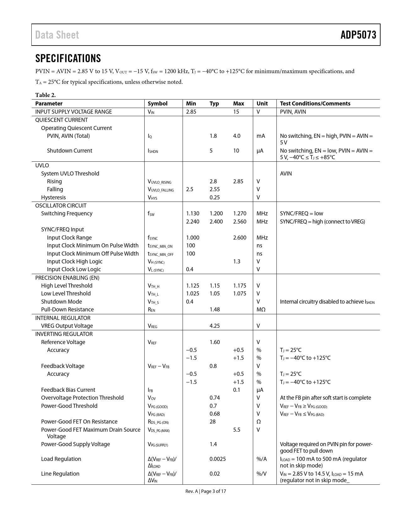 | 页数 / 页 | 17 / 3 — Data Sheet. ADP5073. SPECIFICATIONS. Table 2. Parameter. Symbol. Min. … |