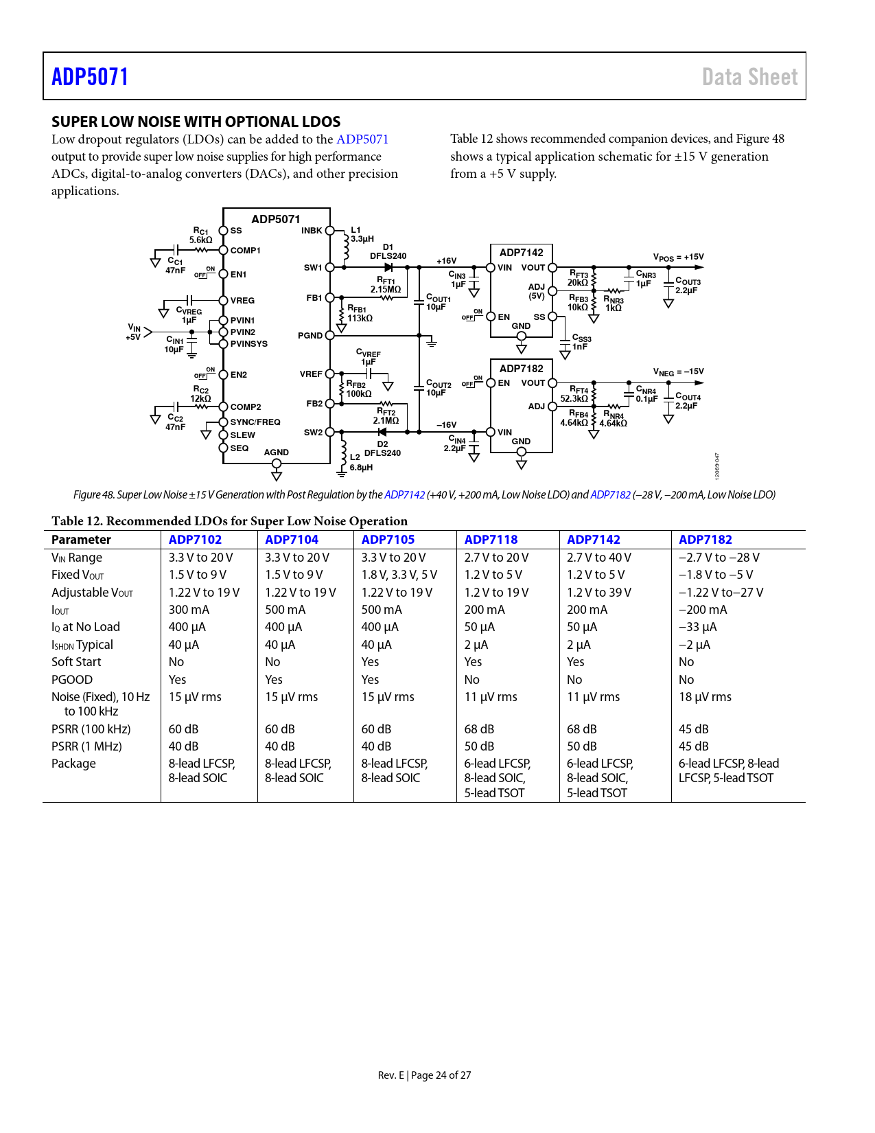 link to page 24 link to page 24 ADP5071Data SheetSUPER LOW NOISE WITH OPTIONAL LDOS Low dropout regulators (LDOs) can be added to the ADP5071 Table 12 shows recommended companion devices, and Figure 48 output to provide super low noise supplies for high performance shows a typical application schematic for ±15 V generation ADCs, digital-to-analog converters (DACs), and other precision from a +5 V supply. applications. ADP5071RC1SSINBKL15.6kΩ3.3µHCOMP1D1ADP7142CDFLS240VPOS = +15VC1+16VSW147nFVINVOUTEN1CRCRIN3FT3NR3FT11µF20kΩ2.15MΩADJ1µFCOUT3 2.2µF(5V)VREGFB1COUT1RFB3RNR3CR10µF10kΩ1kΩVREGFB11µFPVIN1113kΩENSSVINGNDPVIN2+5VCPGNDCIN1SS3PVINSYS10µF1nFCVREF1µFADP7182EN2VREFVNEG = –15VRCENVOUTRFB2OUT2C2RFT4CNR412kΩ100kΩ10µF52.3kΩ0.1µFCOUT4COMP2FB22.2µFRADJCFT2RFB4RC2NR4SYNC/FREQ2.1MΩ4.64kΩ47nF–16V4.64kΩSLEWSW2VINCIN4GNDSEQD2AGND2.2µFDFLS240L2 047 6.8µH 12069- Figure 48. Super Low Noise ±15 V Generation with Post Regulation by the ADP7142 (+40 V, +200 mA, Low Noise LDO) and ADP7182 (−28 V, −200 mA, Low Noise LDO) Table 12. Recommended LDOs for Super Low Noise Operation ParameterADP7102ADP7104ADP7105ADP7118ADP7142ADP7182 VIN Range 3.3 V to 20 V 3.3 V to 20 V 3.3 V to 20 V 2.7 V to 20 V 2.7 V to 40 V −2.7 V to −28 V Fixed VOUT 1.5 V to 9 V 1.5 V to 9 V 1.8 V, 3.3 V, 5 V 1.2 V to 5 V 1.2 V to 5 V −1.8 V to −5 V Adjustable VOUT 1.22 V to 19 V 1.22 V to 19 V 1.22 V to 19 V 1.2 V to 19 V 1.2 V to 39 V −1.22 V to−27 V IOUT 300 mA 500 mA 500 mA 200 mA 200 mA −200 mA IQ at No Load 400 µA 400 µA 400 µA 50 µA 50 µA −33 µA ISHDN Typical 40 µA 40 µA 40 µA 2 µA 2 µA −2 µA Soft Start No No Yes Yes Yes No PGOOD Yes Yes Yes No No No Noise (Fixed), 10 Hz 15 µV rms 15 µV rms 15 µV rms 11 µV rms 11 µV rms 18 µV rms to 100 kHz PSRR (100 kHz) 60 dB 60 dB 60 dB 68 dB 68 dB 45 dB PSRR (1 MHz) 40 dB 40 dB 40 dB 50 dB 50 dB 45 dB Package 8-lead LFCSP, 8-lead LFCSP, 8-lead LFCSP, 6-lead LFCSP, 6-lead LFCSP, 6-lead LFCSP, 8-lead 8-lead SOIC 8-lead SOIC 8-lead SOIC 8-lead SOIC, 8-lead SOIC, LFCSP, 5-lead TSOT 5-lead TSOT 5-lead TSOT Rev. E | Page 24 of 27 Document Outline Features Applications Typical Application Circuit General Description Revision History Specifications Absolute Maximum Ratings Thermal Resistance ESD Caution Pin Configurations and Function Descriptions Typical Performance Characteristics Theory of Operation PWM Mode PSM Mode Undervoltage Lockout (UVLO) Oscillator and Synchronization Internal Regulators Precision Enabling Soft Start Slew Rate Control Current-Limit Protection Overvoltage Protection Thermal Shutdown Start-Up Sequence Applications Information ADIsimPower Design Tool Component Selection Feedback Resistors Output Capacitors Input Capacitor VREG Capacitor VREF Capacitor Soft Start Resistor Diodes Inductor Selection for the Boost Regulator Inductor Selection for the Inverting Regulator Loop Compensation Boost Regulator Inverting Regulator Common Applications Super Low Noise With Optional LDOs SEPIC Step-Up/Step-Down Operation Layout Considerations Outline Dimensions Ordering Guide
