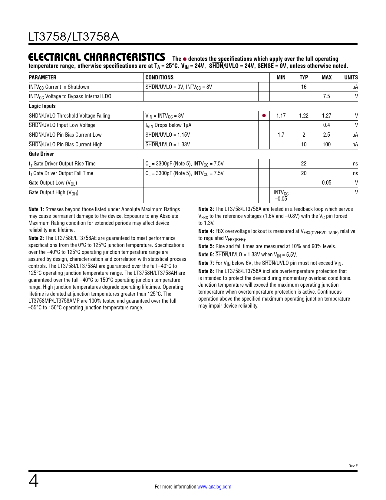 LT3758/LT3758A ELECTRICAL CHARACTERISTICSThe l denotes the specifications which apply over the full operatingtemperature range, otherwise specifications are at TA = 25°C. VIN = 24V, SHDN/UVLO = 24V, SENSE = 0V, unless otherwise noted.PARAMETERCONDITIONSMINTYPMAXUNITS INTVCC Current in Shutdown SHDN/UVLO = 0V, INTVCC = 8V 16 µA INTVCC Voltage to Bypass Internal LDO 7.5 V Logic Inputs SHDN/UVLO Threshold Voltage Falling VIN = INTVCC = 8V l 1.17 1.22 1.27 V SHDN/UVLO Input Low Voltage IVIN Drops Below 1µA 0.4 V SHDN/UVLO Pin Bias Current Low SHDN/UVLO = 1.15V 1.7 2 2.5 µA SHDN/UVLO Pin Bias Current High SHDN/UVLO = 1.33V 10 100 nA Gate Driver tr Gate Driver Output Rise Time CL = 3300pF (Note 5), INTVCC = 7.5V 22 ns tf Gate Driver Output Fall Time CL = 3300pF (Note 5), INTVCC = 7.5V 20 ns Gate Output Low (VOL) 0.05 V Gate Output High (VOH) INTVCC V –0.05 Note 1: Stresses beyond those listed under Absolute Maximum Ratings Note 3: The LT3758/LT3758A are tested in a feedback loop which servos may cause permanent damage to the device. Exposure to any Absolute VFBX to the reference voltages (1.6V and –0.8V) with the VC pin forced Maximum Rating condition for extended periods may affect device to 1.3V. reliability and lifetime. Note 4: FBX overvoltage lockout is measured at VFBX(OVERVOLTAGE) relative Note 2: The LT3758E/LT3758AE are guaranteed to meet performance to regulated VFBX(REG). specifications from the 0°C to 125°C junction temperature. Specifications Note 5: Rise and fall times are measured at 10% and 90% levels. over the –40°C to 125°C operating junction temperature range are Note 6: SHDN/UVLO = 1.33V when V assured by design, characterization and correlation with statistical process IN = 5.5V. controls. The LT3758I/LT3758AI are guaranteed over the full –40°C to Note 7: For VIN below 6V, the SHDN/UVLO pin must not exceed VIN. 125°C operating junction temperature range. The LT3758H/LT3758AH are Note 8: The LT3758/LT3758A include overtemperature protection that guaranteed over the full –40°C to 150°C operating junction temperature is intended to protect the device during momentary overload conditions. range. High junction temperatures degrade operating lifetimes. Operating Junction temperature will exceed the maximum operating junction lifetime is derated at junction temperatures greater than 125°C. The temperature when overtemperature protection is active. Continuous LT3758MP/LT3758AMP are 100% tested and guaranteed over the full operation above the specified maximum operating junction temperature –55°C to 150°C operating junction temperature range. may impair device reliability. Rev F 4 For more information www.analog.com Document Outline Features Applications Description Typical Application Absolute Maximum Ratings Pin Configuration Order Information Electrical Characteristics Typical Performance Characteristics Pin Functions Block Diagram Applications Information Typical Applications Package Description Revision History Typical Applications Related Parts Typical Applications Features Applications Typical Application Description Absolute Maximum Ratings Pin Configuration Order Information Electrical Characteristics Typical Performance Characteristics Pin Functions Block Diagram Applications Information Typical Applications Package Description Revision History Typical Application Related Parts