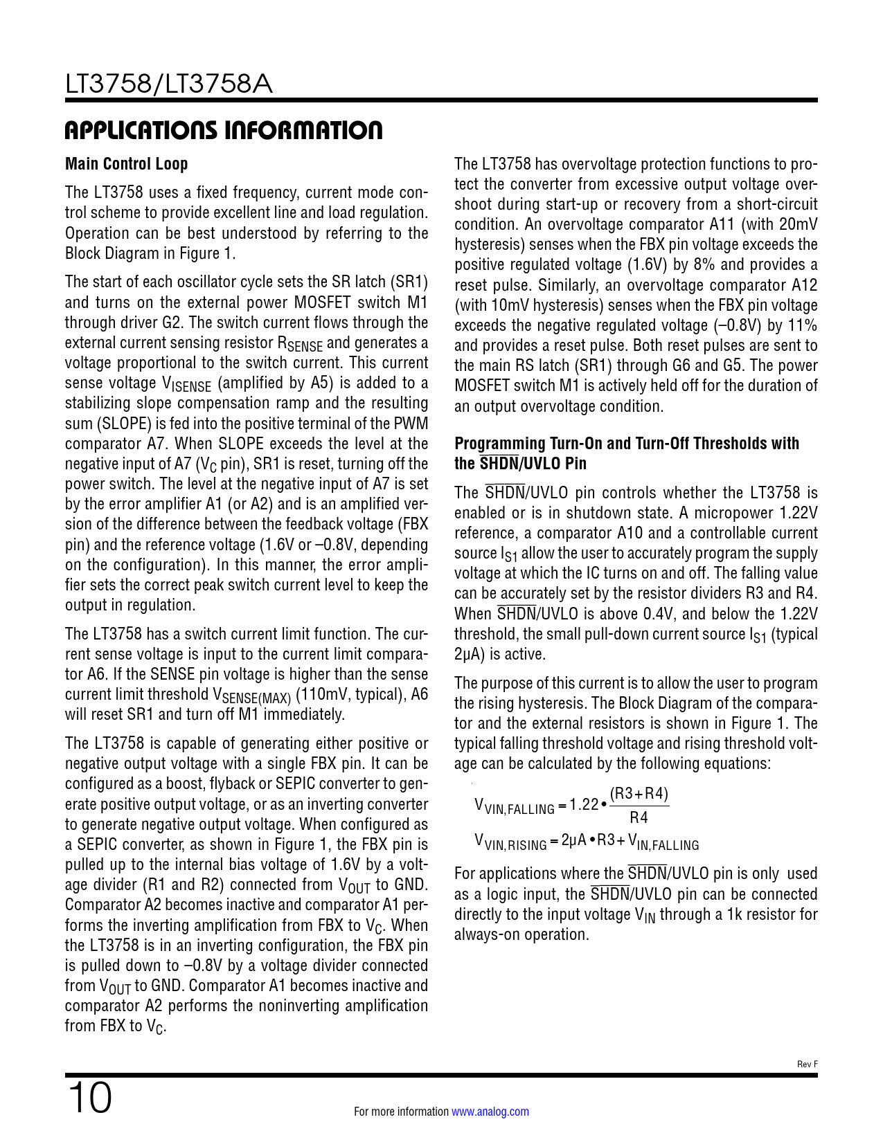 link to page 9 link to page 9 link to page 9 link to page 9 LT3758/LT3758A APPLICATIONS INFORMATIONMain Control Loop The LT3758 has overvoltage protection functions to pro- The LT3758 uses a fixed frequency, current mode con- tect the converter from excessive output voltage over- trol scheme to provide excellent line and load regulation. shoot during start-up or recovery from a short-circuit Operation can be best understood by referring to the condition. An overvoltage comparator A11 (with 20mV Block Diagram in Figure 1. hysteresis) senses when the FBX pin voltage exceeds the positive regulated voltage (1.6V) by 8% and provides a The start of each oscillator cycle sets the SR latch (SR1) reset pulse. Similarly, an overvoltage comparator A12 and turns on the external power MOSFET switch M1 (with 10mV hysteresis) senses when the FBX pin voltage through driver G2. The switch current flows through the exceeds the negative regulated voltage (–0.8V) by 11% external current sensing resistor RSENSE and generates a and provides a reset pulse. Both reset pulses are sent to voltage proportional to the switch current. This current the main RS latch (SR1) through G6 and G5. The power sense voltage VISENSE (amplified by A5) is added to a MOSFET switch M1 is actively held off for the duration of stabilizing slope compensation ramp and the resulting an output overvoltage condition. sum (SLOPE) is fed into the positive terminal of the PWM comparator A7. When SLOPE exceeds the level at the Programming Turn-On and Turn-Off Thresholds with negative input of A7 (VC pin), SR1 is reset, turning off the the SHDN/UVLO Pin power switch. The level at the negative input of A7 is set The SHDN/UVLO pin controls whether the LT3758 is by the error amplifier A1 (or A2) and is an amplified ver- enabled or is in shutdown state. A micropower 1.22V sion of the difference between the feedback voltage (FBX reference, a comparator A10 and a controllable current pin) and the reference voltage (1.6V or –0.8V, depending source I on the configuration). In this manner, the error ampli- S1 al ow the user to accurately program the supply voltage at which the IC turns on and off. The falling value fier sets the correct peak switch current level to keep the can be accurately set by the resistor dividers R3 and R4. output in regulation. When SHDN/UVLO is above 0.4V, and below the 1.22V The LT3758 has a switch current limit function. The cur- threshold, the small pull-down current source IS1 (typical rent sense voltage is input to the current limit compara- 2µA) is active. tor A6. If the SENSE pin voltage is higher than the sense The purpose of this current is to allow the user to program current limit threshold VSENSE(MAX) (110mV, typical), A6 the rising hysteresis. The Block Diagram of the compara- will reset SR1 and turn off M1 immediately. tor and the external resistors is shown in Figure 1. The The LT3758 is capable of generating either positive or typical falling threshold voltage and rising threshold volt- negative output voltage with a single FBX pin. It can be age can be calculated by the following equations: configured as a boost, flyback or SEPIC converter to gen- erate positive output voltage, or as an inverting converter (R3 V +R4) VIN,FALLING = 1.22 • to generate negative output voltage. When configured as R4 a SEPIC converter, as shown in Figure 1, the FBX pin is VVIN,RISING = 2µA •R3+ VIN,FALLING pulled up to the internal bias voltage of 1.6V by a volt- For applications where the SHDN/UVLO pin is only used age divider (R1 and R2) connected from VOUT to GND. as a logic input, the SHDN/UVLO pin can be connected Comparator A2 becomes inactive and comparator A1 per- directly to the input voltage V forms the inverting amplification from FBX to V IN through a 1k resistor for C. When always-on operation. the LT3758 is in an inverting configuration, the FBX pin is pulled down to –0.8V by a voltage divider connected from VOUT to GND. Comparator A1 becomes inactive and comparator A2 performs the noninverting amplification from FBX to VC. Rev F 10 For more information www.analog.com Document Outline Features Applications Description Typical Application Absolute Maximum Ratings Pin Configuration Order Information Electrical Characteristics Typical Performance Characteristics Pin Functions Block Diagram Applications Information Typical Applications Package Description Revision History Typical Applications Related Parts Typical Applications Features Applications Typical Application Description Absolute Maximum Ratings Pin Configuration Order Information Electrical Characteristics Typical Performance Characteristics Pin Functions Block Diagram Applications Information Typical Applications Package Description Revision History Typical Application Related Parts