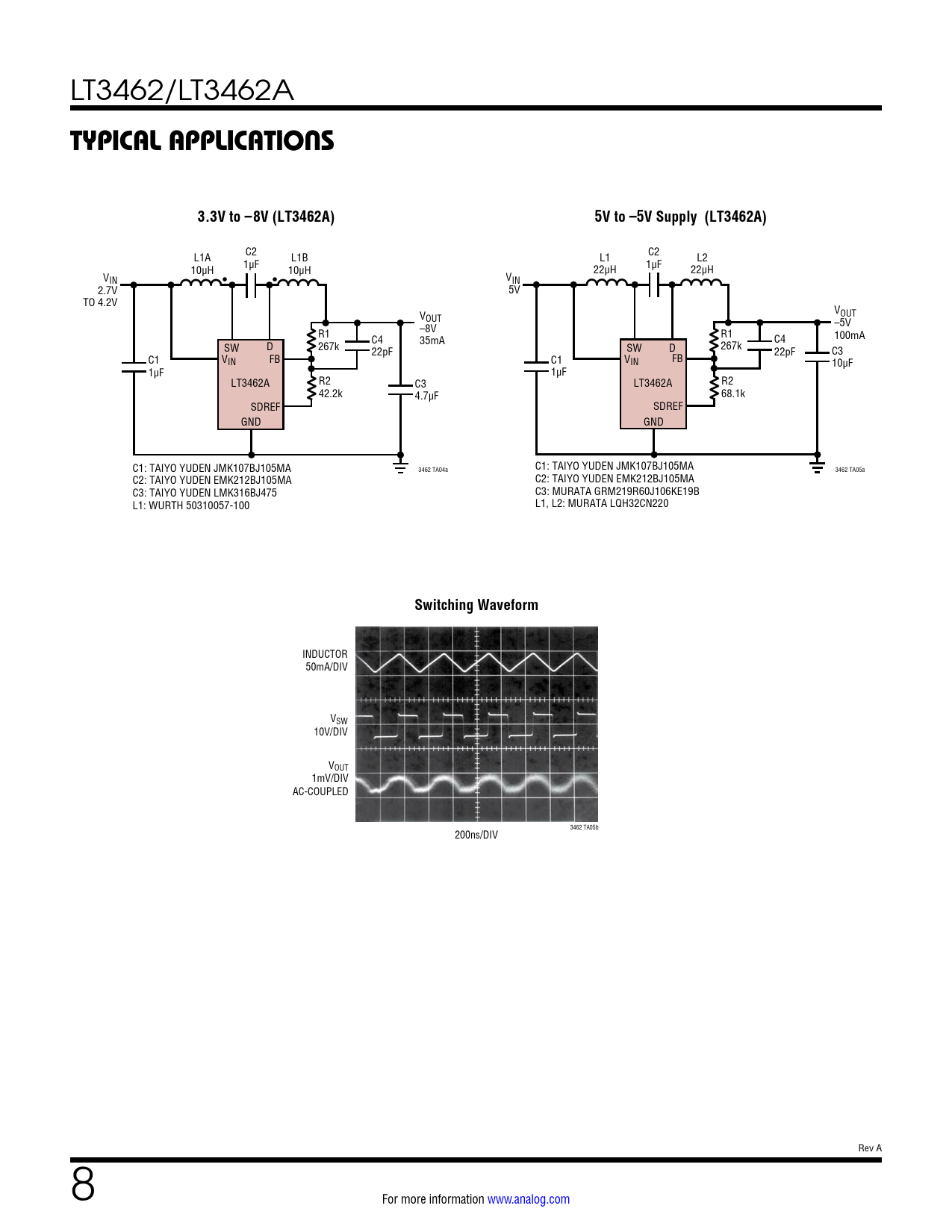 TYPICAL APPLICATIONS. 3.3V to –8V (LT3462A). 5V to –5V Supply (LT3462A). Switching Waveform