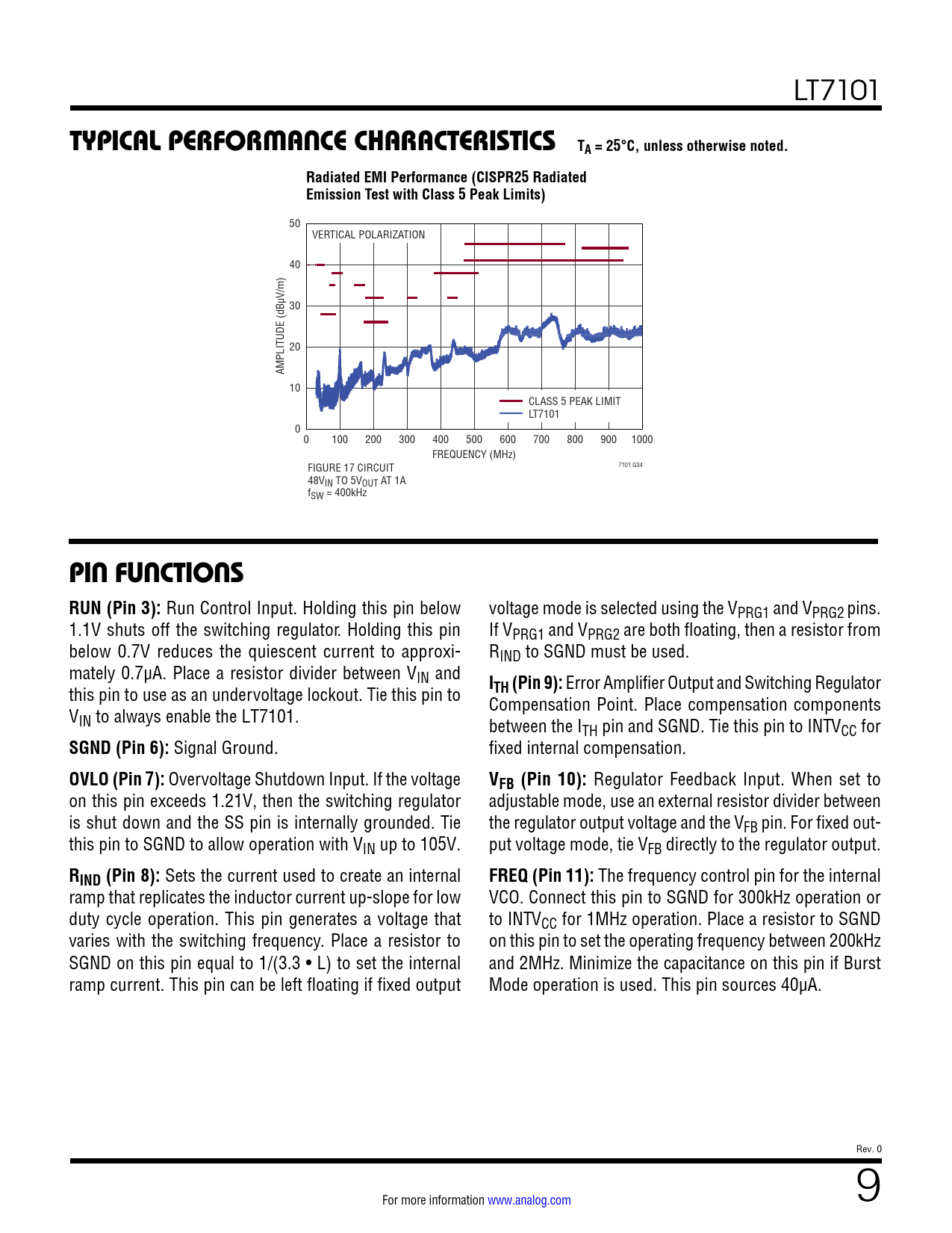 50 VERTICAL POLARIZATION 40 V/m) 30 20 AMPLITUDE (dBµ 10 CLASS 5 PEAK LIMIT LT7101 0 0 100 200 300 400 500 600 700 800 900 1000 FREQUENCY (MHz) FIGURE 17 CIRCUIT 7101 G34 48VIN TO 5VOUT AT 1A fSW = 400kHz