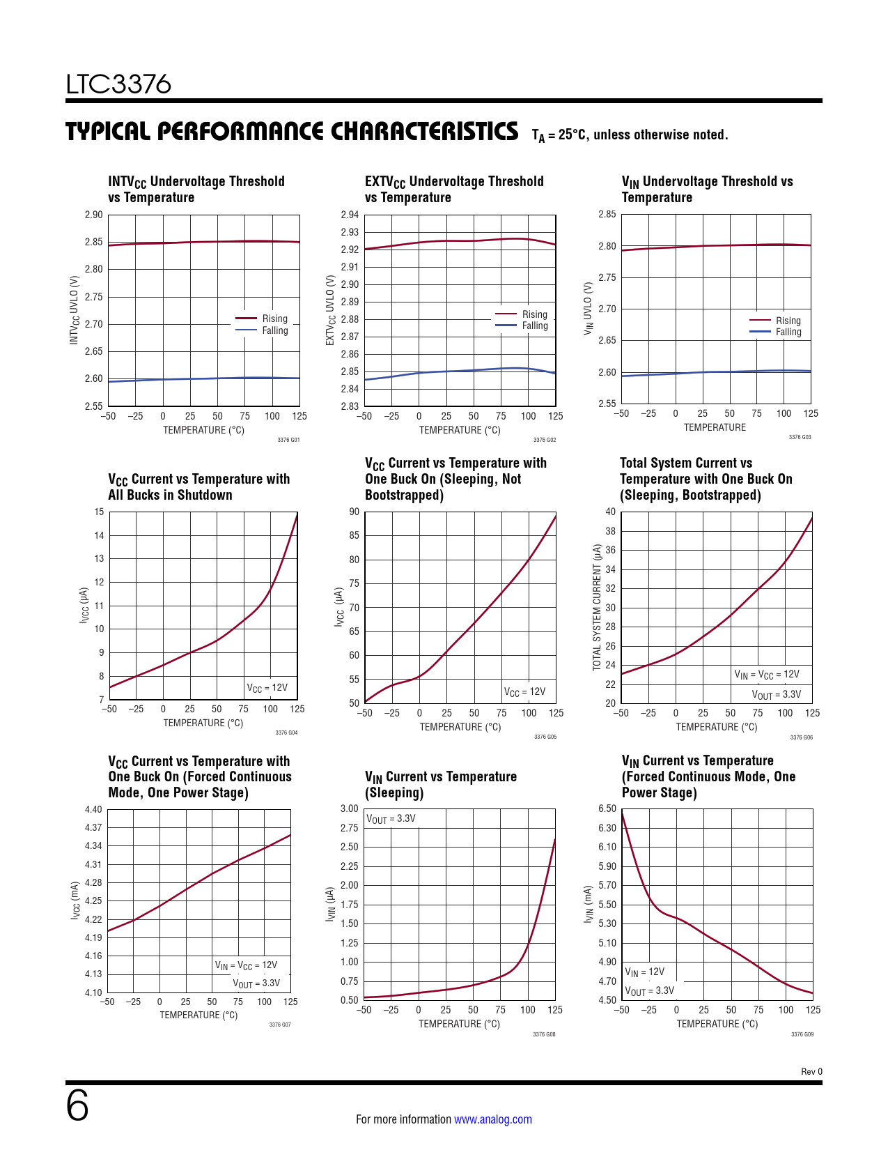 15 90 40 14 85 38 36 13 80 34 12 75 32 (µA) 11 (µA) 70 30 I VCC 10 I VCC 65 28 26 9 60 AL SYSTEM CURRENT (µA) 24 TOT 8 55 VIN = VCC = 12V V 22 CC = 12V V 7 CC = 12V VOUT = 3.3V –50 –25 0 25 50 75 100 125 50 20 –50 –25 0 25 50 75 100 125 –50 –25 0 25 50 75 100 125 TEMPERATURE (°C) TEMPERATURE (°C) TEMPERATURE (°C) 3376 G04 3376 G05 3376 G06