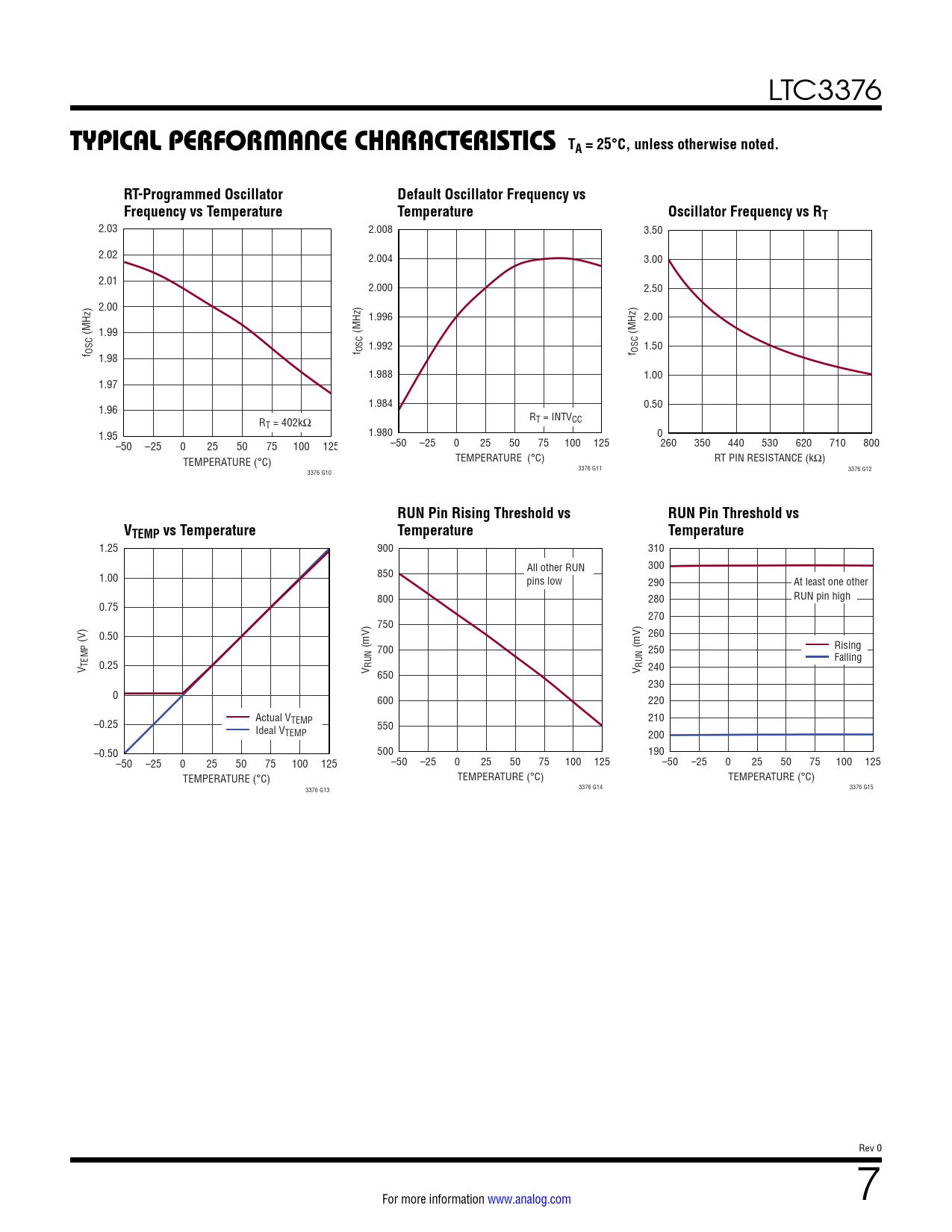 1.25 900 310 All other RUN 300 850 1.00 pins low 290 At least one other 800 RUN pin high 280 0.75 270 750 260 0.50 (V) (mV) 700 (mV) Rising 250 Falling 0.25 V TEMP V RUN 240 650 V RUN 230 0 600 220 Actual VTEMP 210 –0.25 550 Ideal VTEMP 200 –0.50 500 190 –50 –25 0 25 50 75 100 125 –50 –25 0 25 50 75 100 125 –50 –25 0 25 50 75 100 125 TEMPERATURE (°C) TEMPERATURE (°C) TEMPERATURE (°C) 3376 G14 3376 G15 3376 G13 Rev 0 For more information www.analog.com 7 Document Outline Features Applications Typical Application Description Absolute Maximum Ratings Order Information Electrical Characteristics Pin Configuration Typical Performance Characteristics Pin Functions Block Diagram Operation Applications Information Package Description Typical Application Related Parts