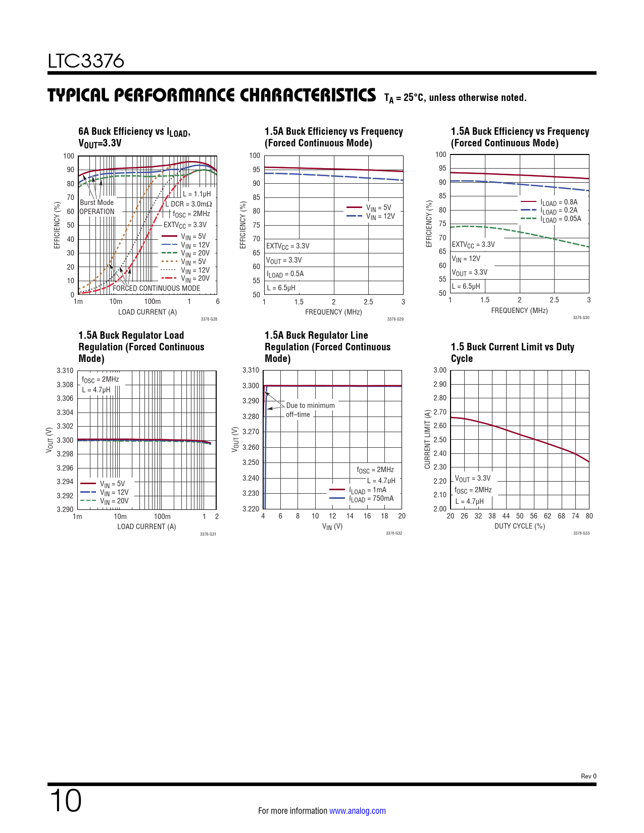 100 100 100 90 95 95 80 90 90 L = 1.1µH 70 85 85 Burst Mode L DCR = 3.0mΩ ILOAD = 0.8A 60 OPERATION V f IN = 5V 80 80 I OSC = 2MHz V LOAD = 0.2A IN = 12V ILOAD = 0.05A 50 EXTVCC = 3.3V 75 75 V 40 IN = 5V 70 70 EFFICIENCY (%) VIN = 12V EFFICIENCY (%) EXTVCC = 3.3V EFFICIENCY (%) EXTVCC = 3.3V 30 VIN = 20V 65 65 V V IN = 5V VOUT = 3.3V IN = 12V 20 60 V 60 IN = 12V I V V LOAD = 0.5A OUT = 3.3V 10 IN = 20V 55 55 FORCED CONTINUOUS MODE L = 6.5µH L = 6.5µH 0 50 50 1m 10m 100m 1 6 1 1.5 2 2.5 3 1 1.5 2 2.5 3 LOAD CURRENT (A) FREQUENCY (MHz) FREQUENCY (MHz) 3376 G28 3376 G29 3376 G30