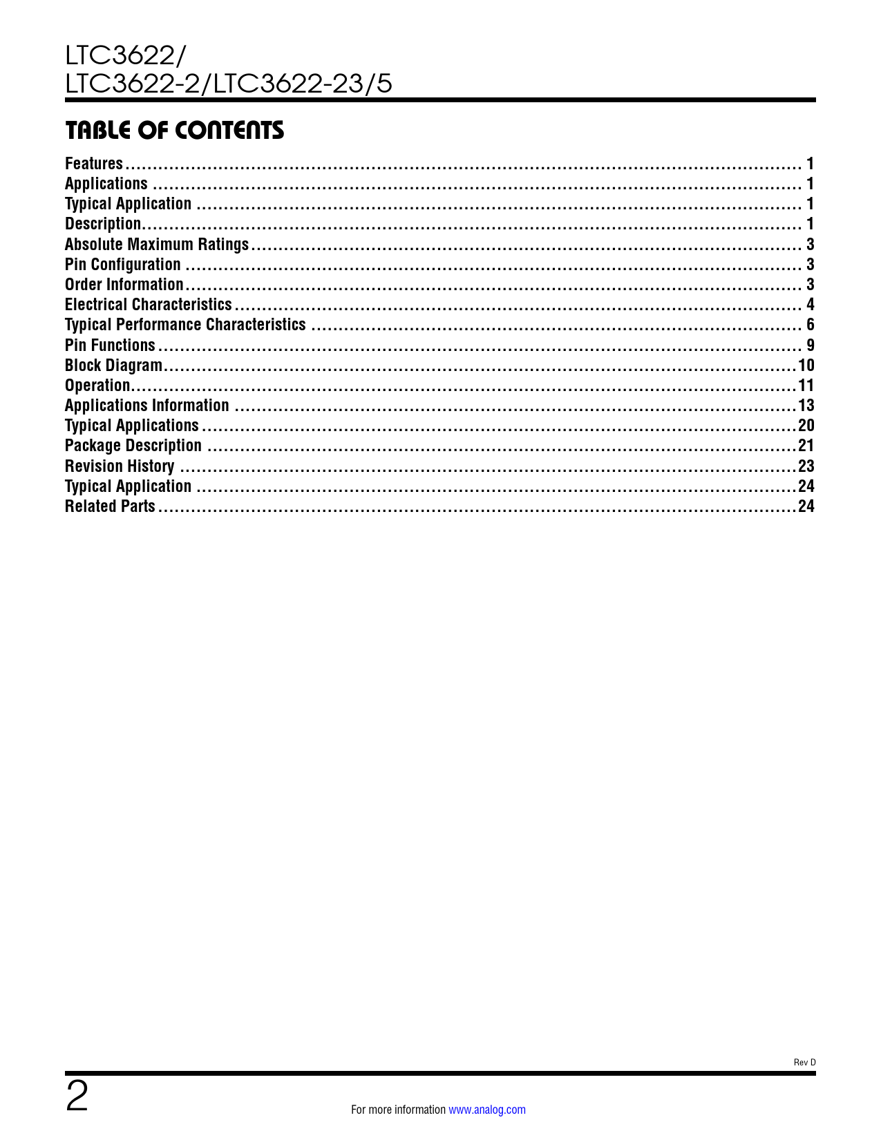link to page 1 link to page 1 link to page 1 link to page 1 link to page 3 link to page 3 link to page 3 link to page 4 link to page 6 link to page 9 link to page 10 link to page 11 link to page 13 link to page 20 link to page 21 link to page 23 link to page 24 link to page 24 LTC3622/ LTC3622-2/LTC3622-23/5 TABLE OF CONTENTSFeatures .. 1Applications ... 1Typical Application ... 1Description... 1Absolute Maximum Ratings ... 3Pin Configuration ... 3Order Information ... 3Electrical Characteristics .. 4Typical Performance Characteristics .. 6Pin Functions .. 9Block Diagram ..10Operation..11Applications Information ...13Typical Applications ...20Package Description ..21Revision History ...23Typical Application ..24Related Parts ...24 Rev D 2 For more information www.analog.com Document Outline Features Applications Description Typical Application Absolute Maximum Ratings Pin Configuration Order Information Electrical Characteristics Typical Performance Characteristics Pin Functions Block Diagram Operation Applications Information Typical Applications Package Description Revision History Typical Application Related Parts