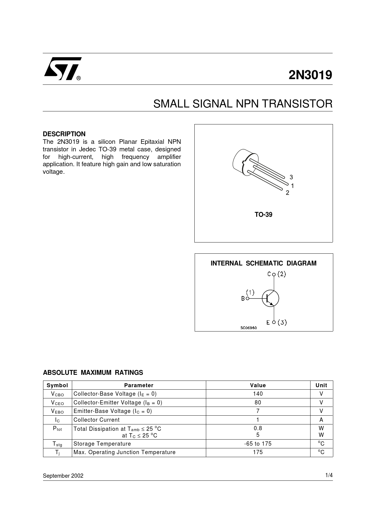 2N3019. DESCRIPTION. TO-39. INTERNAL SCHEMATIC DIAGRAM. ABSOLUTE MAXIMUM RATINGS. Symbol. Parameter. Value. Unit