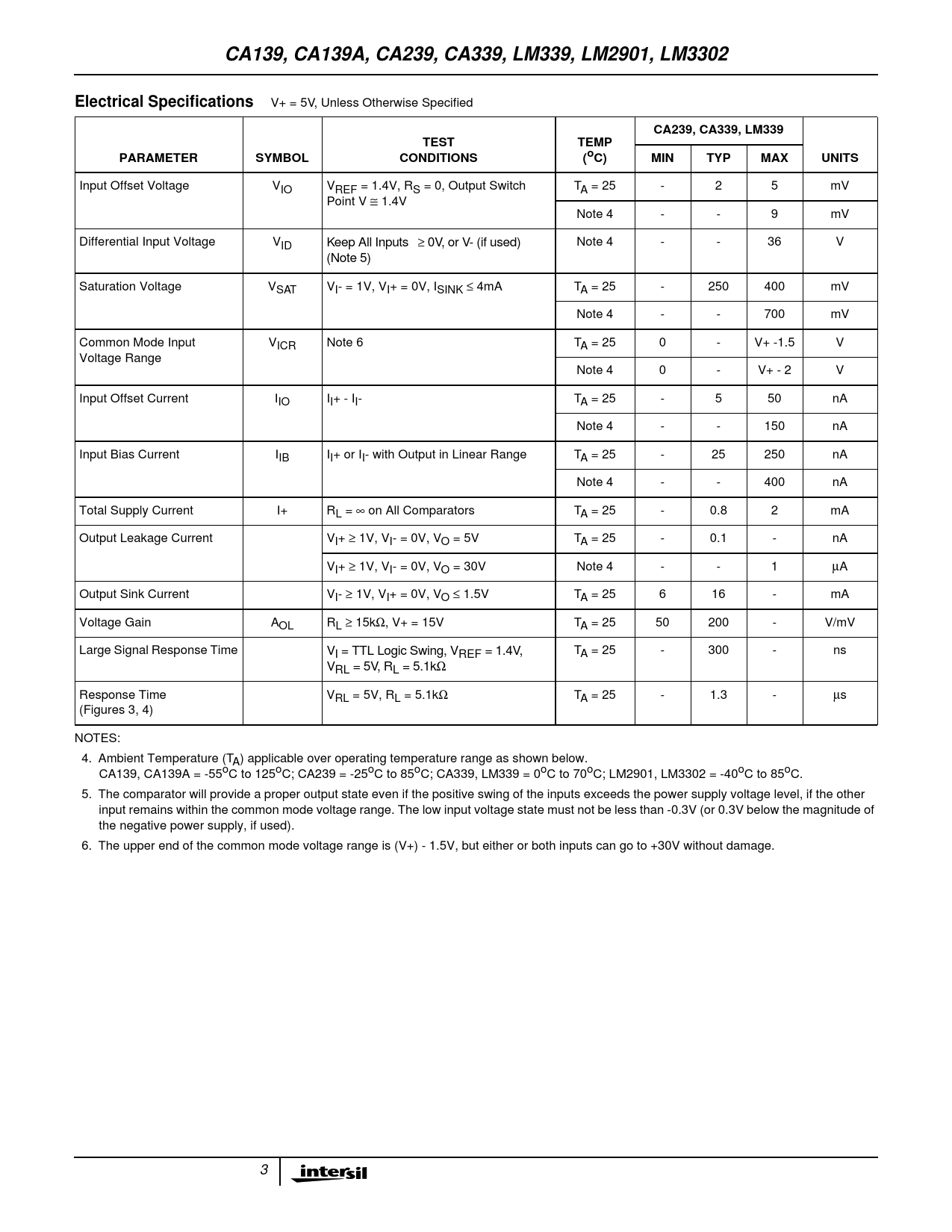 CA139, CA139A, CA239, CA339, LM339, LM2901, LM3302. Electrical Specifications. CA239, CA339, LM339. TEST. TEMP. PARAMETER. SYMBOL