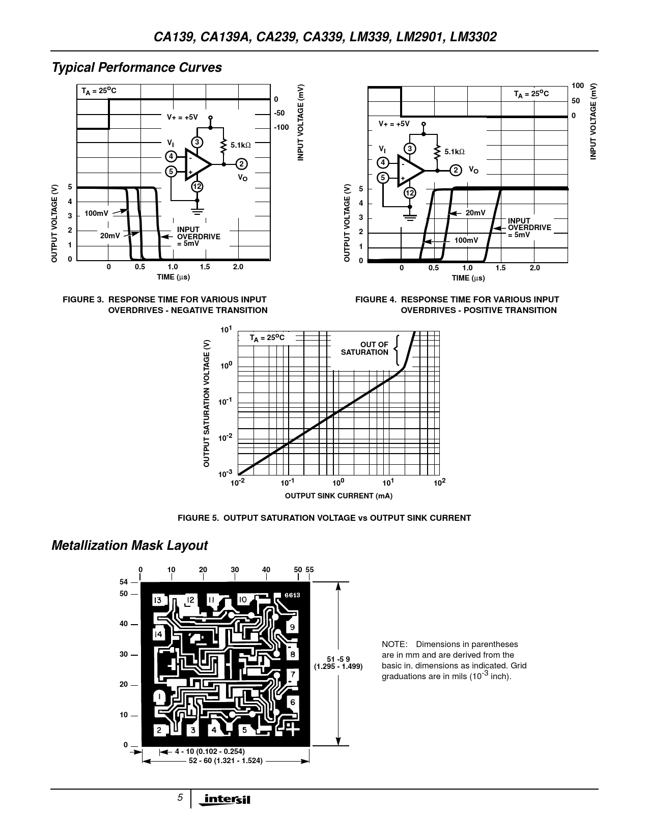 s) FIGURE 3. RESPONSE TIME FOR VARIOUS INPUT FIGURE 4. RESPONSE TIME FOR VARIOUS INPUT OVERDRIVES - NEGATIVE TRANSITION OVERDRIVES - POSITIVE TRANSITION 101 TA = 25oC OUT OF SATURATION GE (V) A 100 T L O TION V 10-1 TURA 10-2 OUTPUT SA 10-3 10-2 10-1 100 101 102 OUTPUT SINK CURRENT (mA) FIGURE 5. OUTPUT SATURATION VOLTAGE vs OUTPUT SINK CURRENT Metallization Mask Layout 0 10 20 30 40 50 55 54 50 40