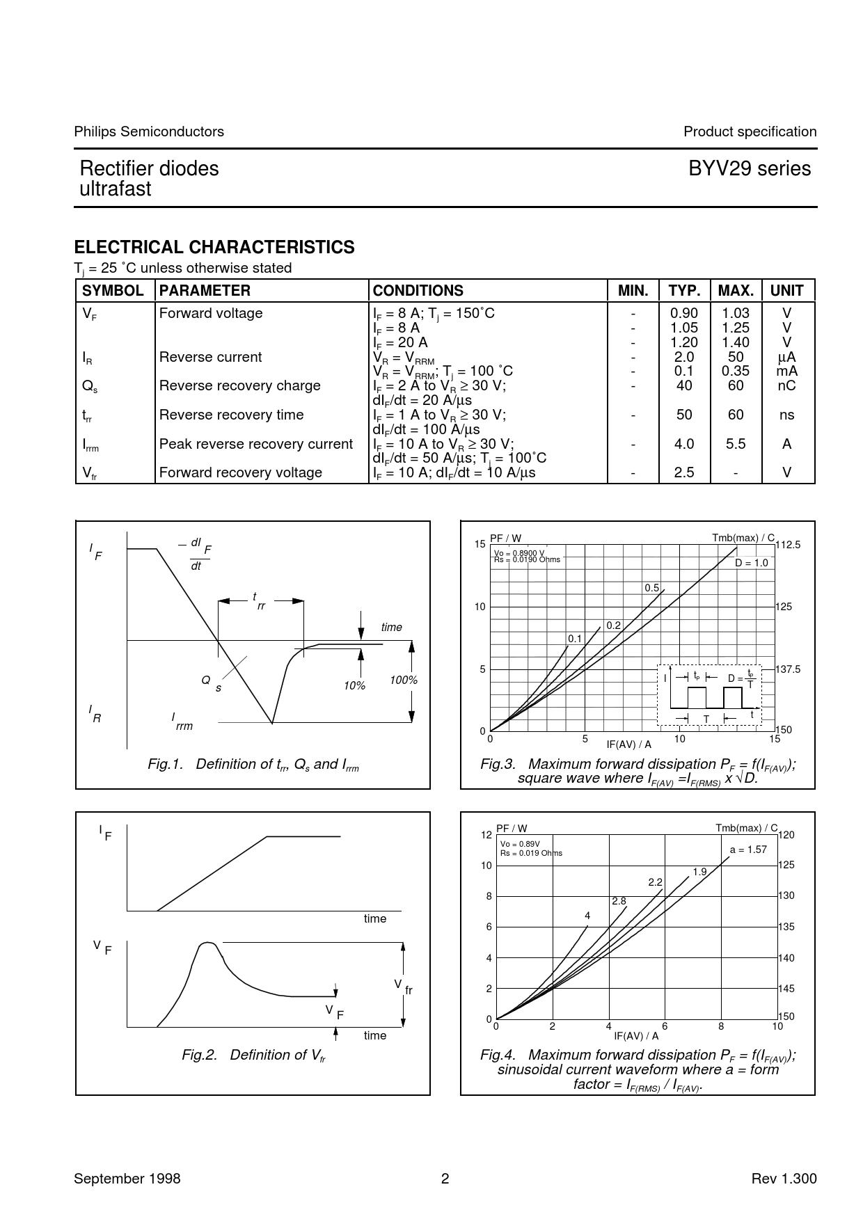 V Forward voltage I = 8 A; T = 150˚C - 0.90 1.03 V F F j I = 8 A - 1.05 1.25 V F I = 20 A - 1.20 1.40 V F I Reverse current V = V - 2.0 50 µA R R RRM V = V ; T = 100 ˚C - 0.1 0.35 mA R RRM j Q Reverse recovery charge I = 2 A to V ≥ 30 V; - 40 60 nC s F R dI /dt = 20 A/µs F t Reverse recovery time I = 1 A to V ≥ 30 V; - 50 60 ns rr F R dI /dt = 100 A/µs F I Peak reverse recovery current I = 10 A to V ≥ 30 V; - 4.0 5.5 A rrm F R dI /dt = 50 A/µs; T = 100˚C F j V Forward recovery voltage I = 10 A; dI /dt = 10 A/µs - 2.5 - V fr F F dI PF / W BYV29 Tmb(max) / C I 15 112.5 F F Vo = 0.8900 V Rs = 0.0190 Ohms dt D = 1.0 0.5 t rr 10 125 time 0.2 0.1 5 t 137.5 p Q 100% tp I D = s 10% T I R I t T rrm 0 150 0 5 10 15 IF(AV) / A Fig.1. Definition of t , Q and I Fig.3. Maximum forward dissipation P = f(I ); rr s rrm F F(AV) square wave where I =I x √D. F(AV) F(RMS) I PF / W BYV29 Tmb(max) / C F 12 120 Vo = 0.89V a = 1.57 Rs = 0.019 Ohms 10 125 1.9 2.2 8 130 2.8 time 4 6 135 V F 4 140 V fr 2 145 V F 0 150 0 2 4 6 8 10 time IF(AV) / A Fig.2. Definition of V Fig.4. Maximum forward dissipation P = f(I ); fr F F(AV) sinusoidal current waveform where a = form factor = I / I . F(RMS) F(AV) September 1998 2 Rev 1.300 Document Outline FEATURES SYMBOL QUICK REFERENCE DATA GENERAL DESCRIPTION PINNING LIMITING VALUES THERMAL RESISTANCES ELECTRICAL CHARACTERISTICS PACKAGE OUTLINE DEFINITIONS