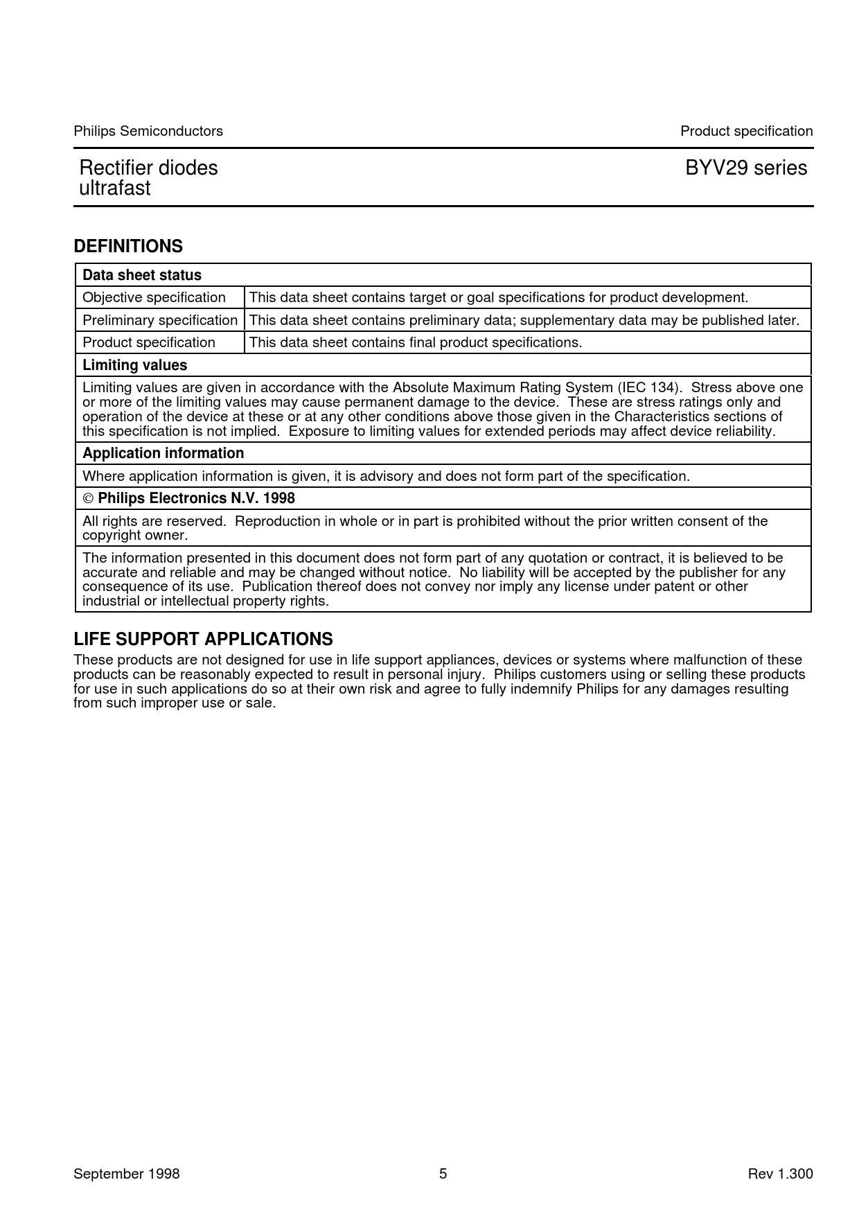 DEFINITIONS Data sheet status Limiting values Application information Philips Electronics N.V 1998