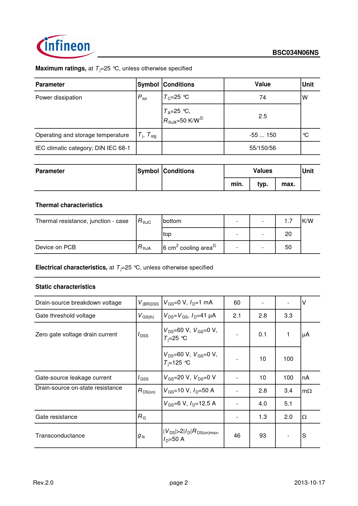 页数 / 页10 / 2 — BSC034N06NS. Maximum ratings,. Parameter. Symbol Conditions. Value. Unit. …