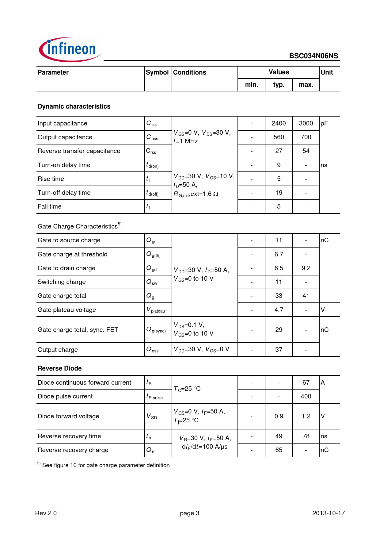 BSC034N06NS. Parameter. Symbol Conditions. Values. Unit. min. typ. max. Dynamic characteristics. Reverse Diode