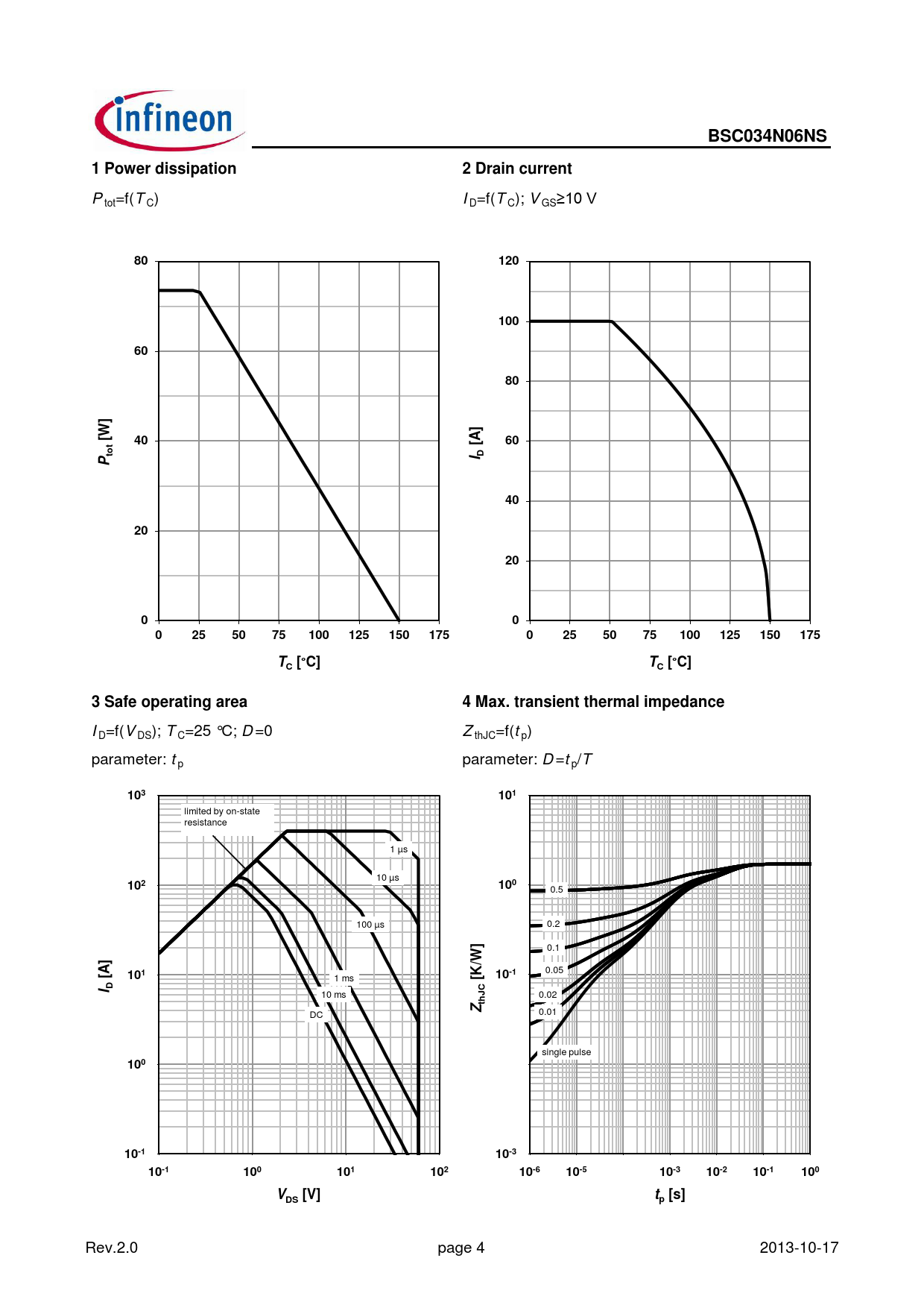 BSC034N06NS 1 Power dissipation 2 Drain current 120 100 otP 125 150 175 [°C] 3 Safe operating area