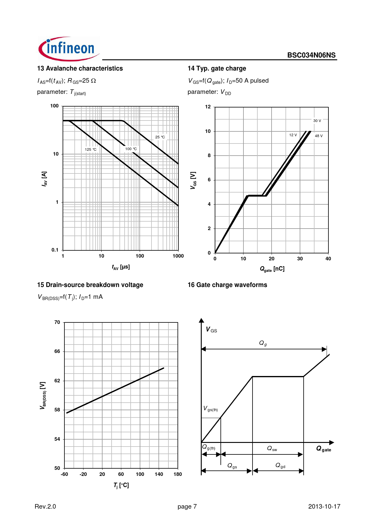 BSC034N06NS13 Avalanche characteristics14 Typ. gate charge I AS=f(t AV); R GS=25 W V GS=f(Q gate); I D=50 A pulsed parameter: T j(start) parameter: V DD 10012 30 V 10 12 V 48 V 25 °C 125 °C 100 °C 108] A[[V]6IAVGSV1420.101101001000010203040t[µs]AVQ[nC]gate15 Drain-source breakdown voltage16 Gate charge waveforms V BR(DSS)=f(T j); I D=1 mA 70V GS Q g 6662[V] )SDS( BRV58 V gs(th) 54 Q g(th) Q sw Qgate Q Q 50 gs gd -60-202060100140180T[°C]j Rev.2.0 page 7 2013-10-17