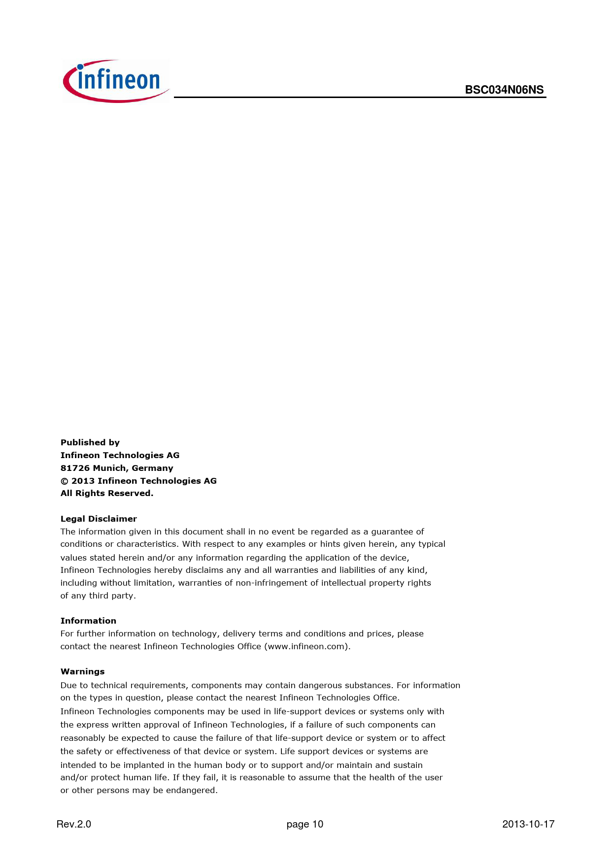 BSC034N06NS Published by Infineon Technologies AG 81726 Munich, Germany © 2013 Infineon Technologies AG All Rights Reserved. Legal Disclaimer