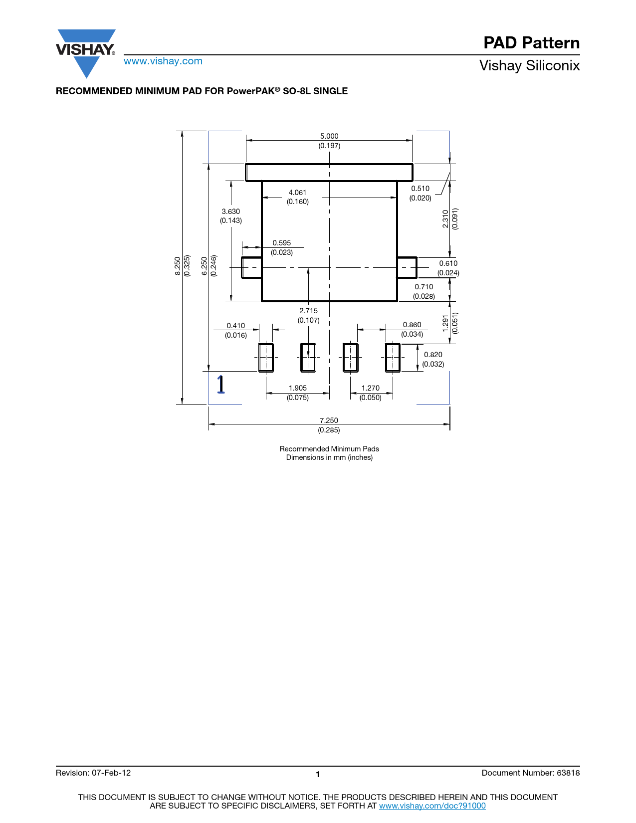 5.000 (0.197) 0.510 4.061 (0.020) (0.160) 3.630 (0.143) 2.310 (0.091) 0.595 (0.023) 0.610 8.250 (0.024) (0.325) 6.250 (0.246) 0.710 (0.028) 2.715 (0.107) 0.410 0.860 1.291 (0.051) (0.016) (0.034) 0.820 (0.032) 1.905 1.270 (0.075) (0.050) 7.250 (0.285) Recommended Minimum Pads Dimensions in mm (inches) Revision: 07-Feb-12